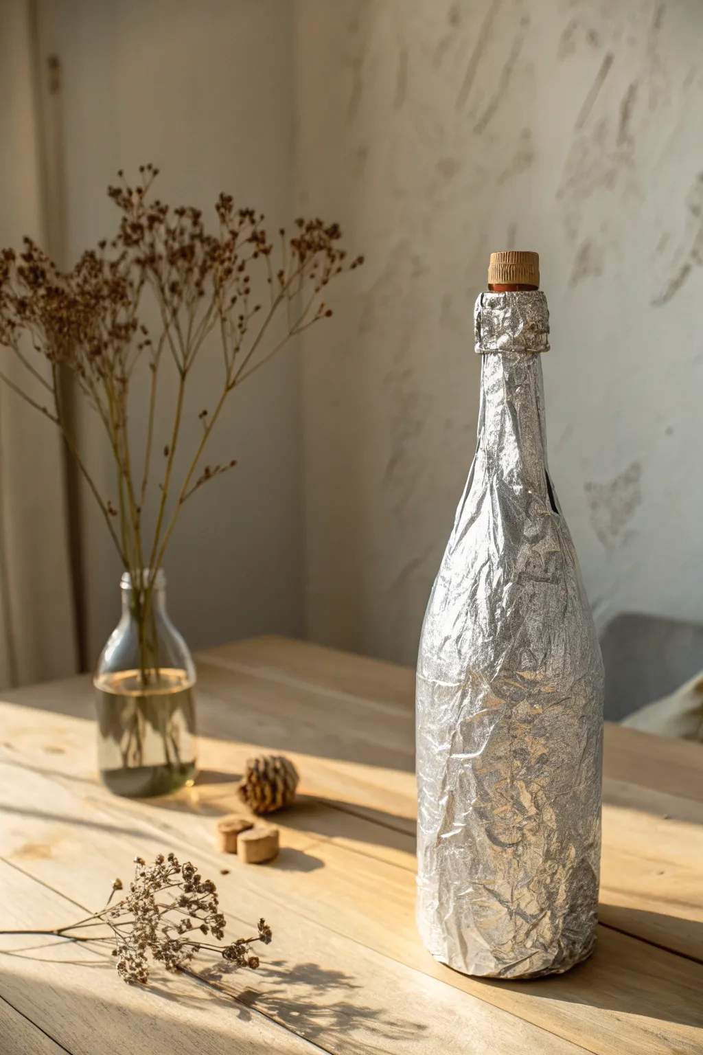 Wrap old bottles in foil for chic decorative pieces. I’ve used this technique on a wine bottle, turning it into a striking vase that catches everyone’s eye.