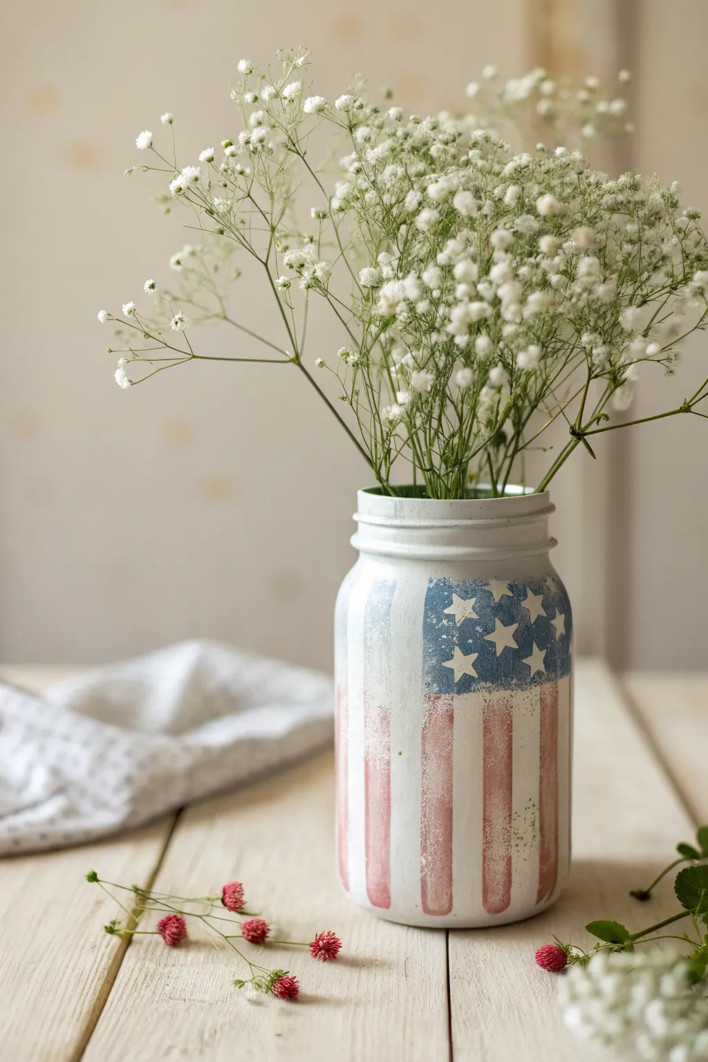 Repurpose your old jars by painting them with flag motifs. These patriotic mason jars make for excellent candle holders or vases, adding a rustic touch to any setting.