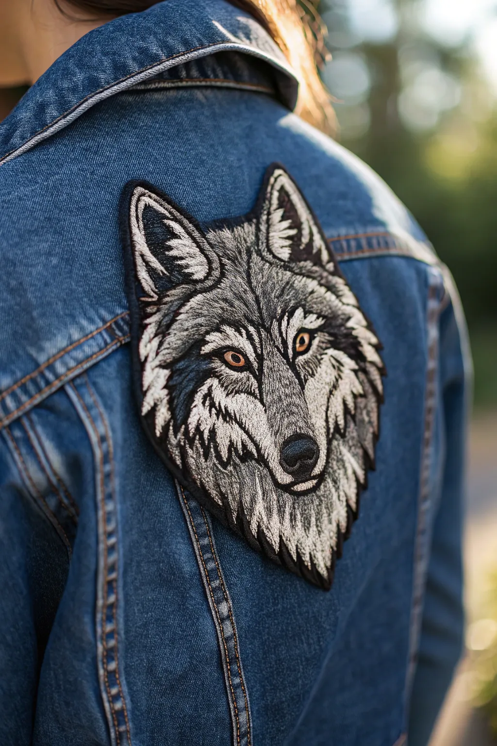 - Wolf Embroidered Back Patch: Add adventure to your outfit with this stunning wolf embroidered back patch.
