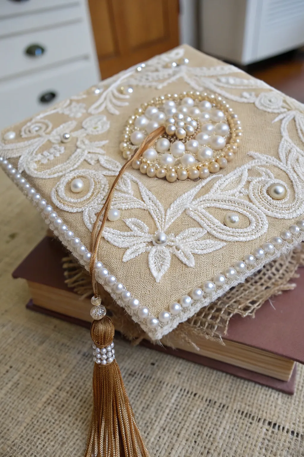 Elevate your graduation cap with a mixed media masterpiece of beads, lace, and burlap for a truly unique and rustic touch. 🎓✨