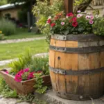 Combine functionality with greenery by turning a keg into a planter table. Drill a hole for drainage, fill with soil, and enjoy your mini garden table.