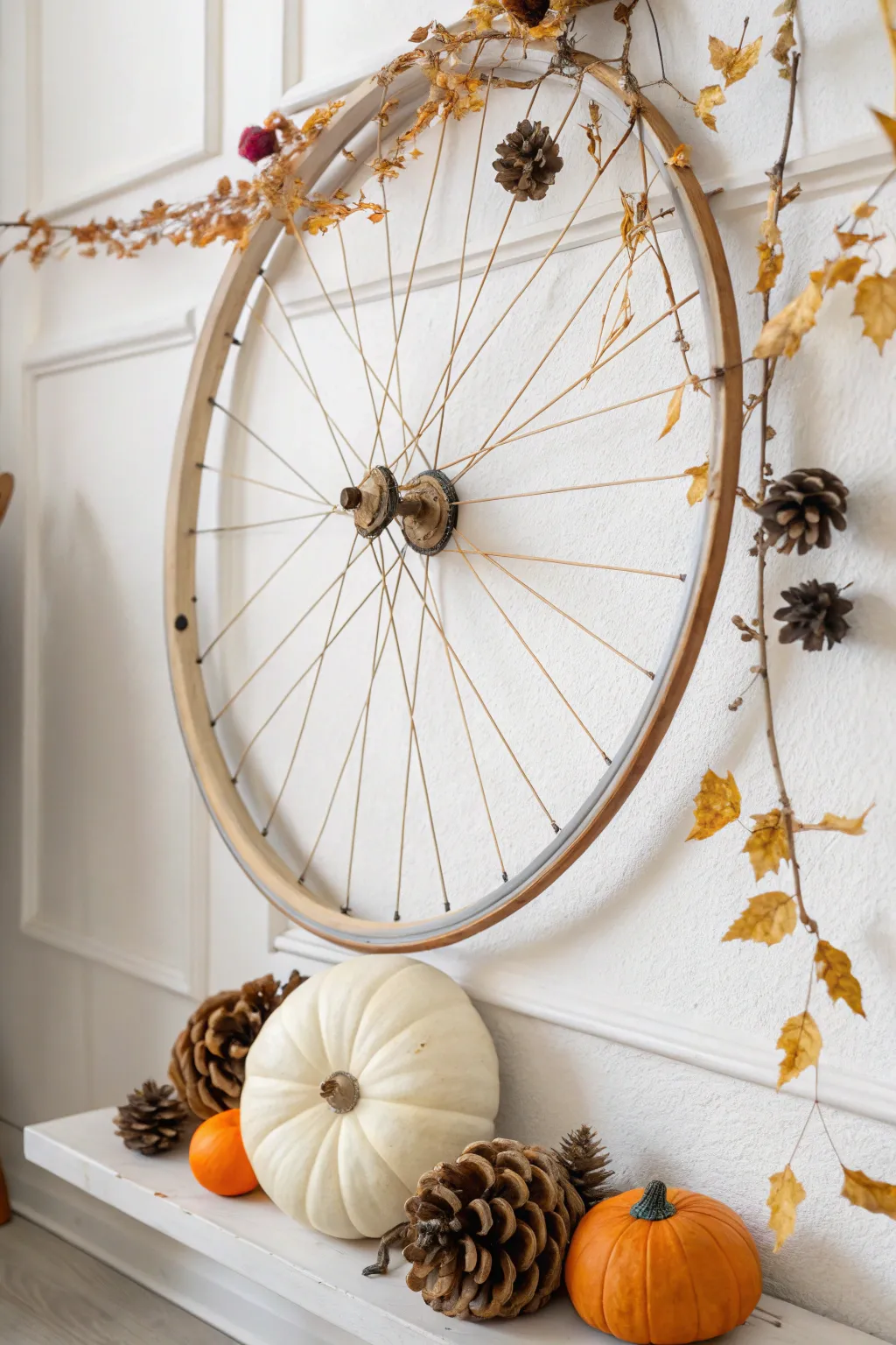 Change up your decor with the seasons by creating a seasonal display. Add autumn leaves, pine cones, or even small pumpkins to your bicycle wheel for a festive touch.