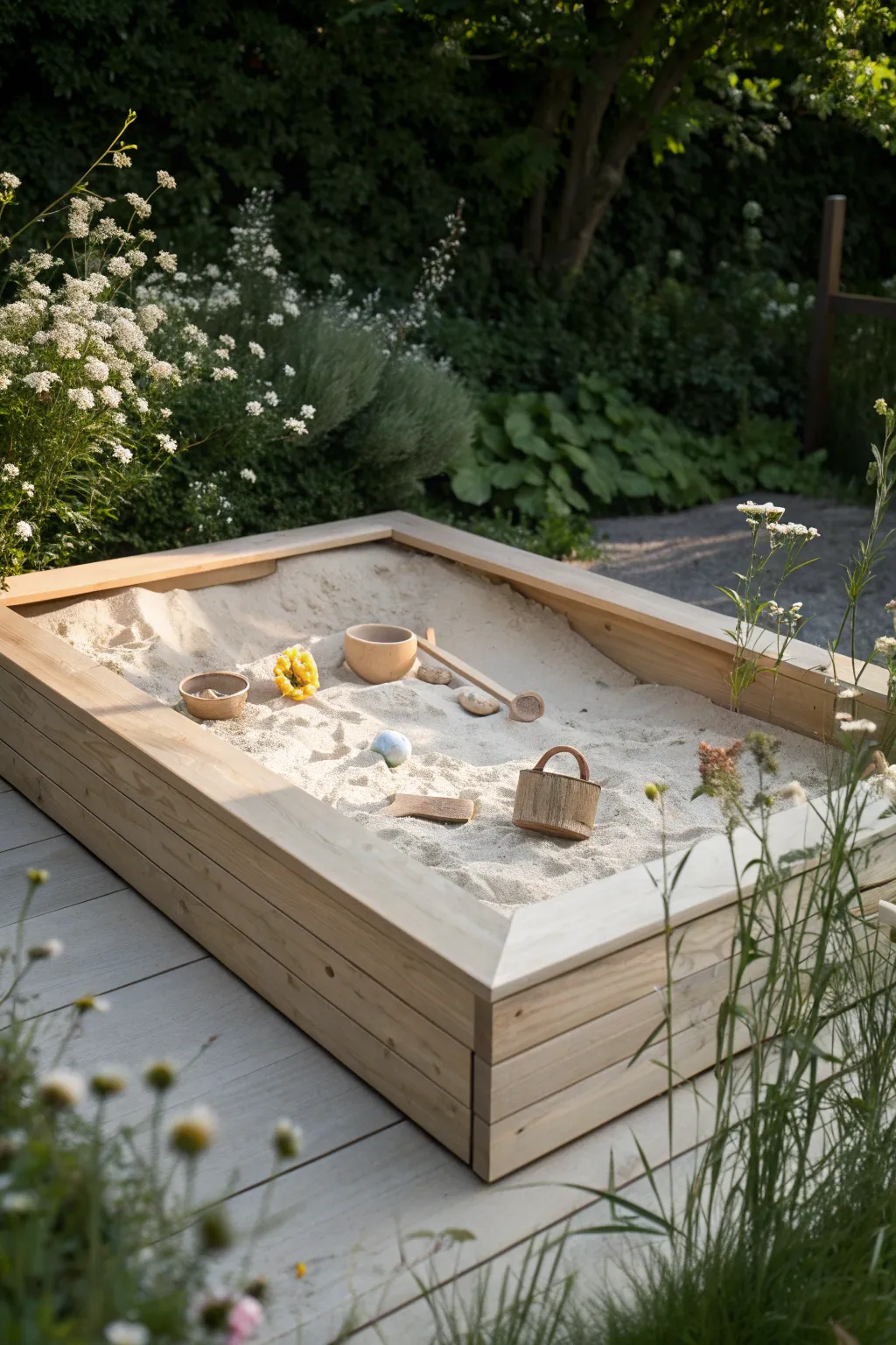 Blend your sandbox into the backyard with landscaped integration, using grass or flower borders. It makes the sandbox feel like a natural part of your garden oasis.