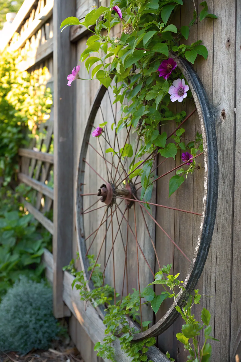 Use the wheel as a base for a garden trellis, training climbing plants to weave through the spokes. It’s a wonderful way to add vertical interest to your garden.