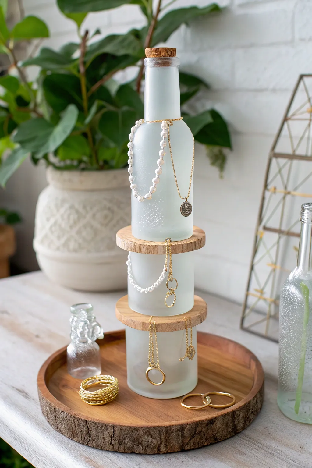 Create a chic jewelry stand by stacking and gluing bottle sections together. It’s a stylish way to keep my necklaces and bracelets organized.