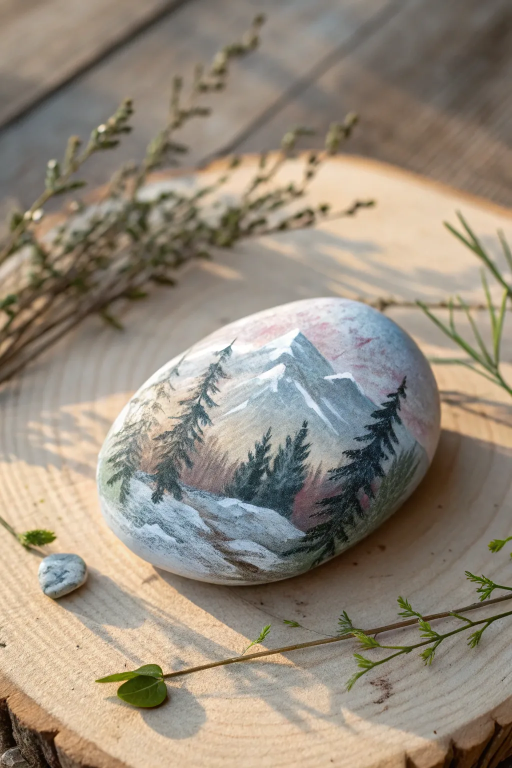 Capture the majesty of the wilderness with rocks painted to show mountain landscapes. Every time I finish one, I’m reminded of the breathtaking views from my favorite trails.