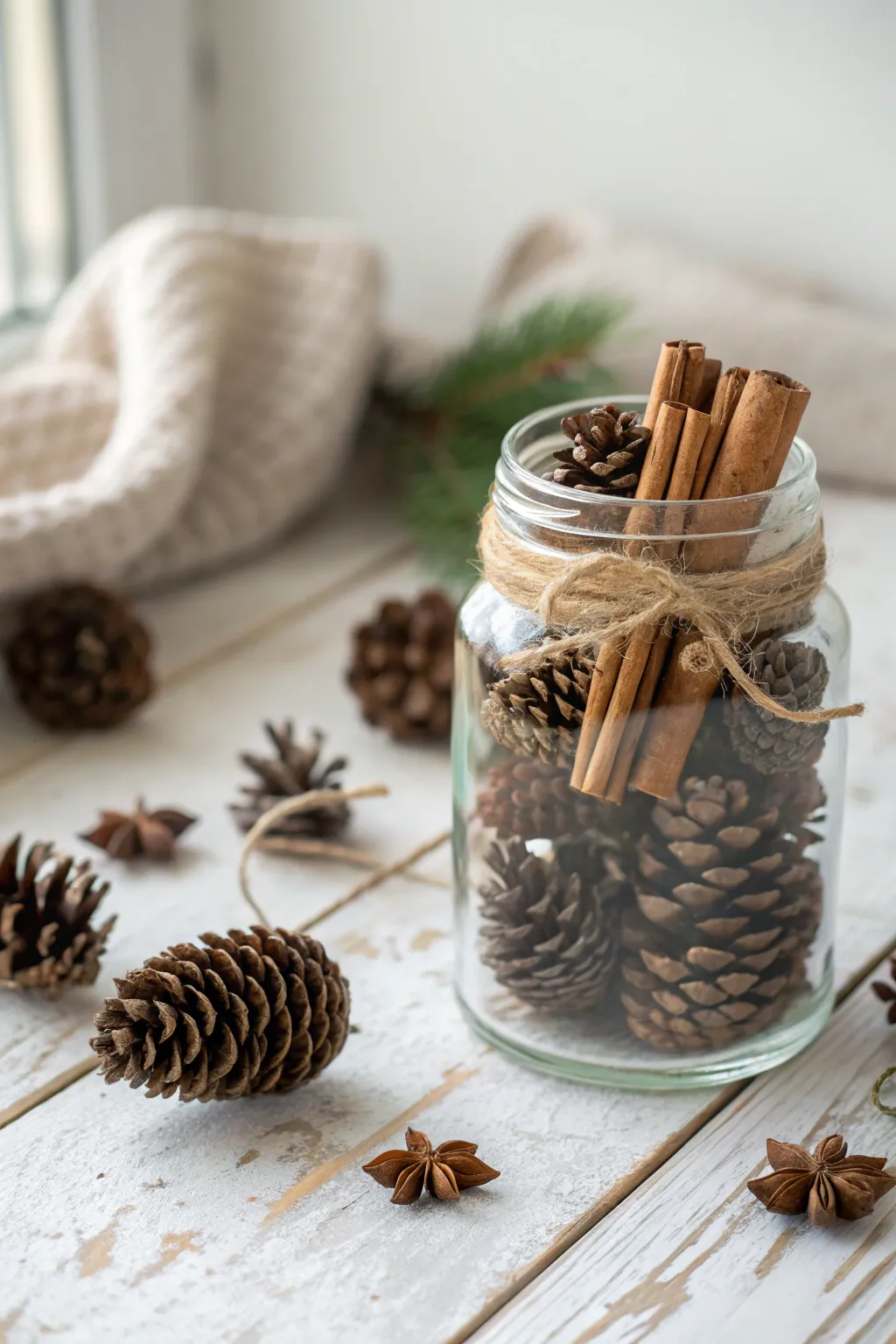 Mix pinecones with cinnamon sticks and cloves in a jar for a natural fall potpourri. It’s a delightful way to scent your home with the essence of autumn.
