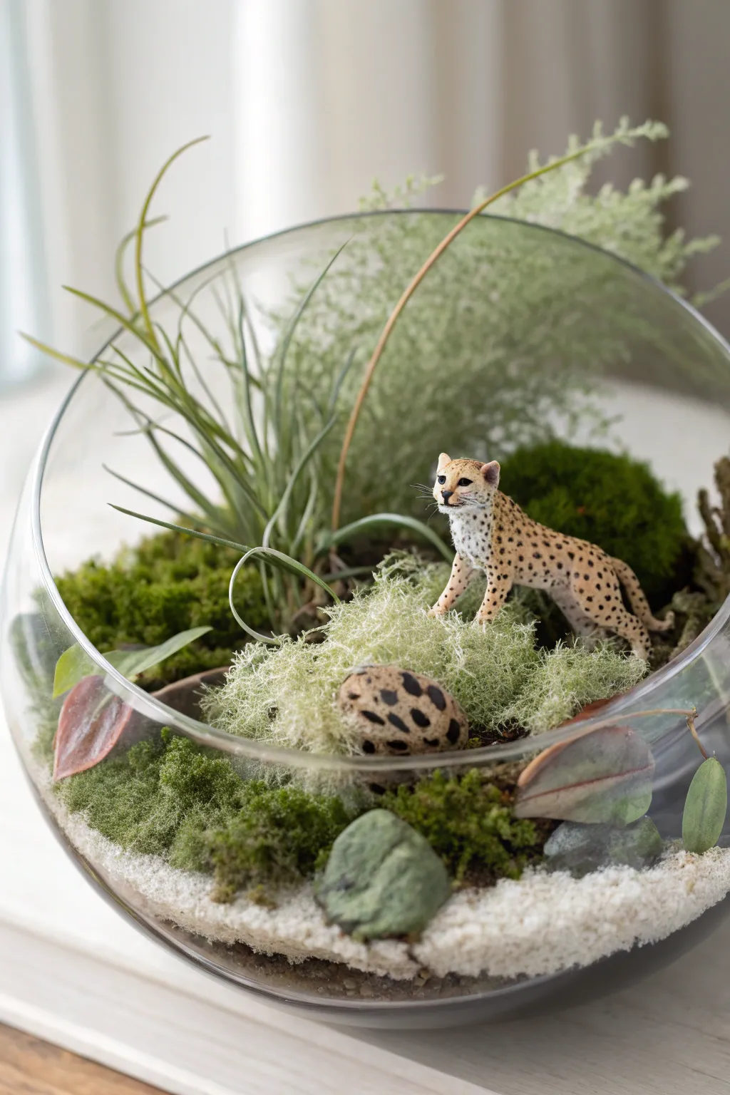 Create a miniature cheetah landscape in a terrarium using small figurines and plants. This is a surprising way to blend nature and art in your home.