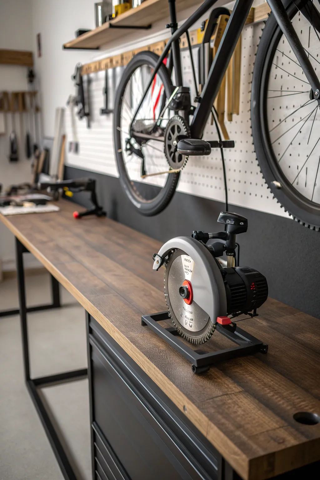 Maximize your workspace: Discover the smart under-bench storage with a bicycle hook.