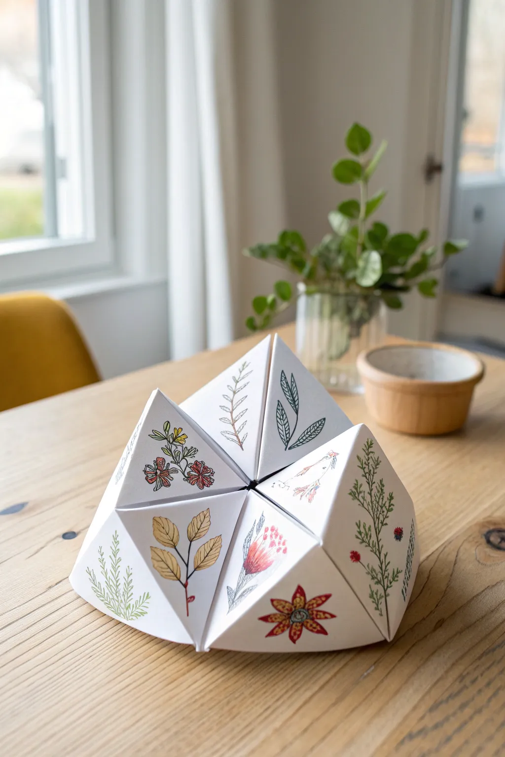 Use earthy tones and add tiny drawings of leaves or animals for a nature-inspired cootie catcher. It’s a soothing addition to any room.