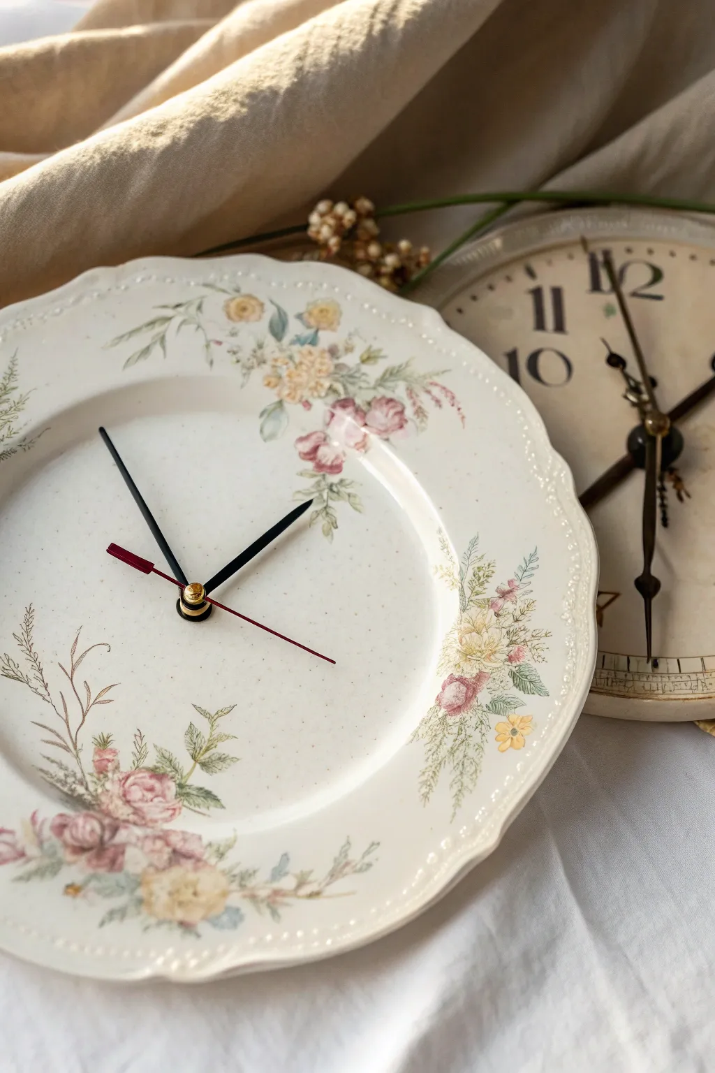 Turn a plate into a clock by adding a clock mechanism. The vintage charm of my plate clock always brings a smile to my face.