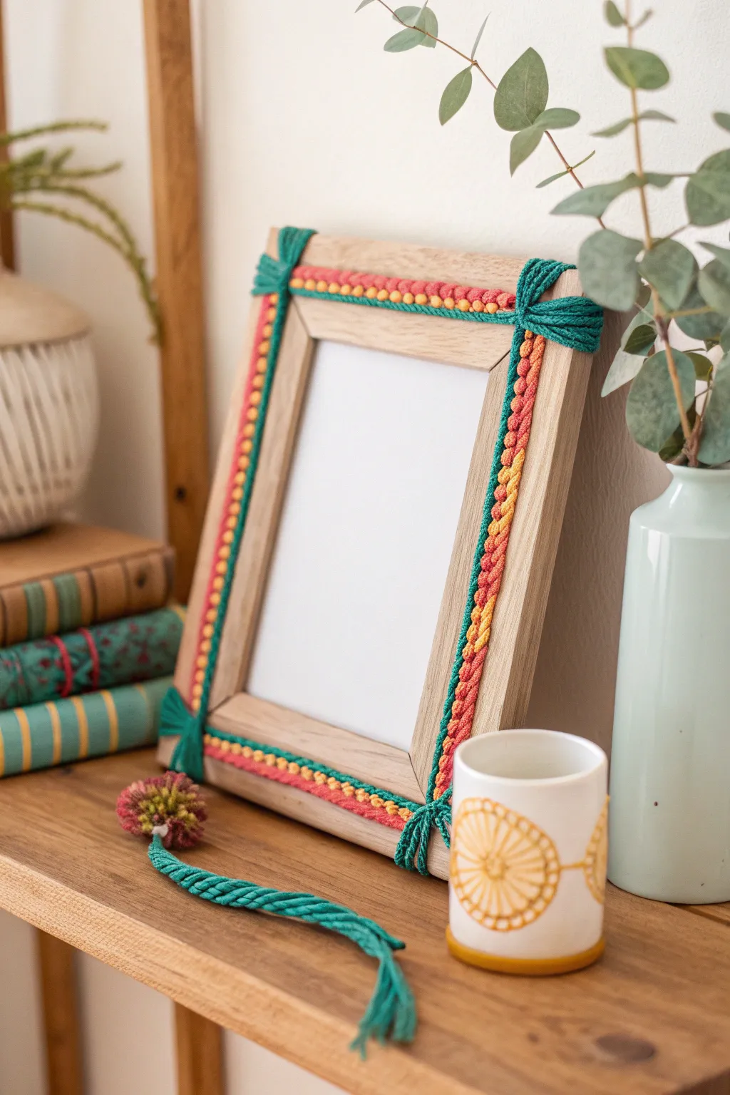 Revamp an old picture frame by wrapping it in colorful string. It’s an easy way to add a pop of color to your photos.