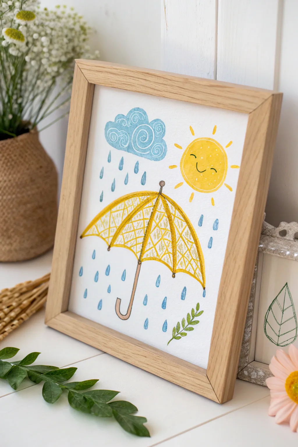 Create a scene with sunshine and rain, complete with an umbrella and raindrops. This dual-weather picture is a great way for kids to experiment with contrasting elements.
