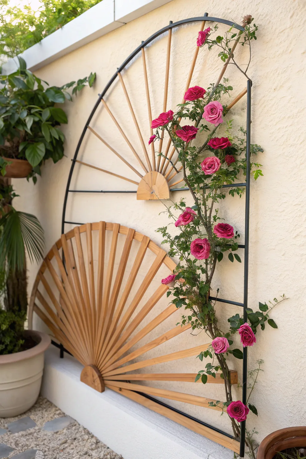 Combine metal rods with wooden slats for a modern twist. It’s a chic way to support your climbing roses.