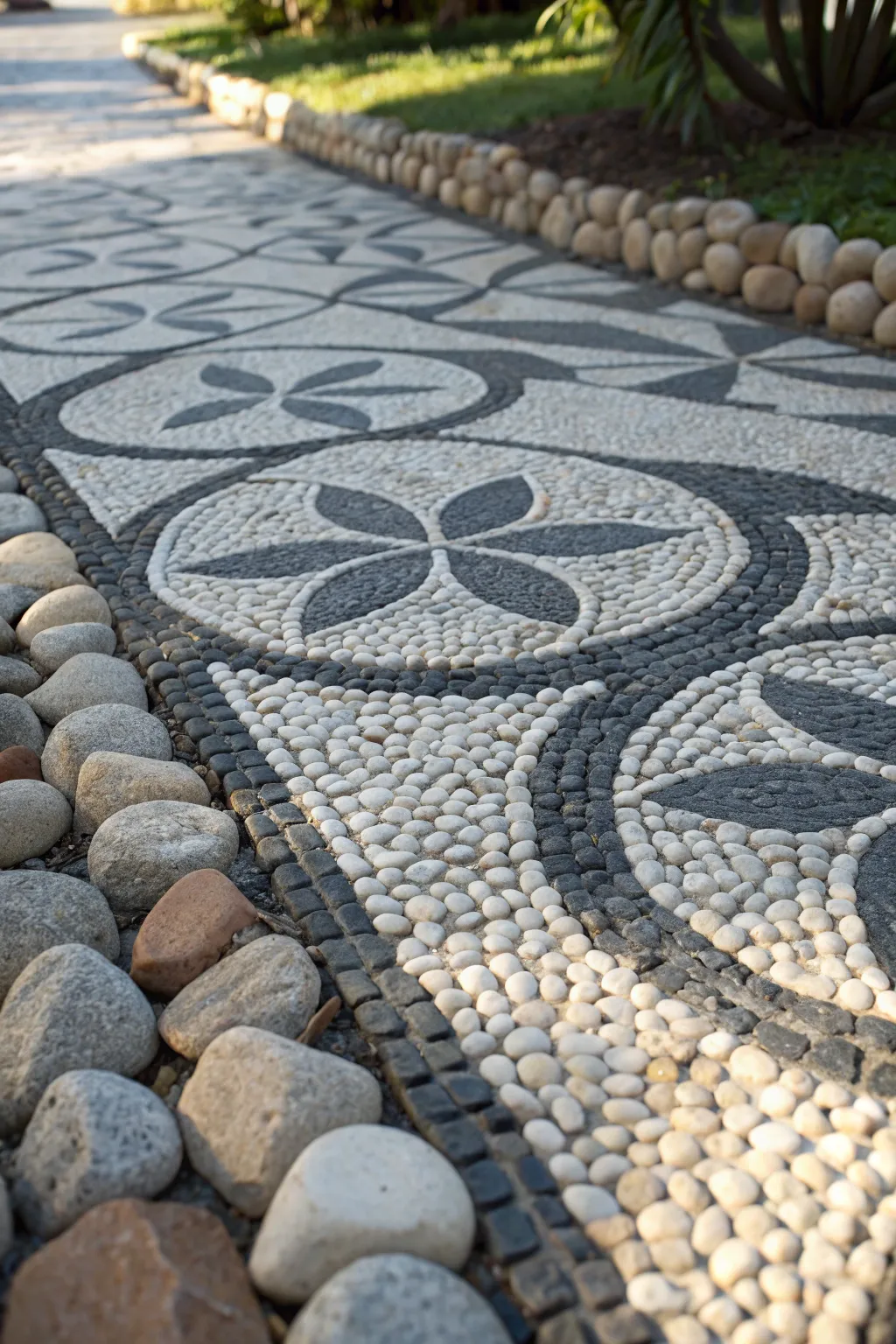 For an artistic touch, design a stone mosaic walkway. It’s a bit more intricate, but arranging pebbles into patterns before setting them in concrete can result in a stunning, one-of-a-kind path.