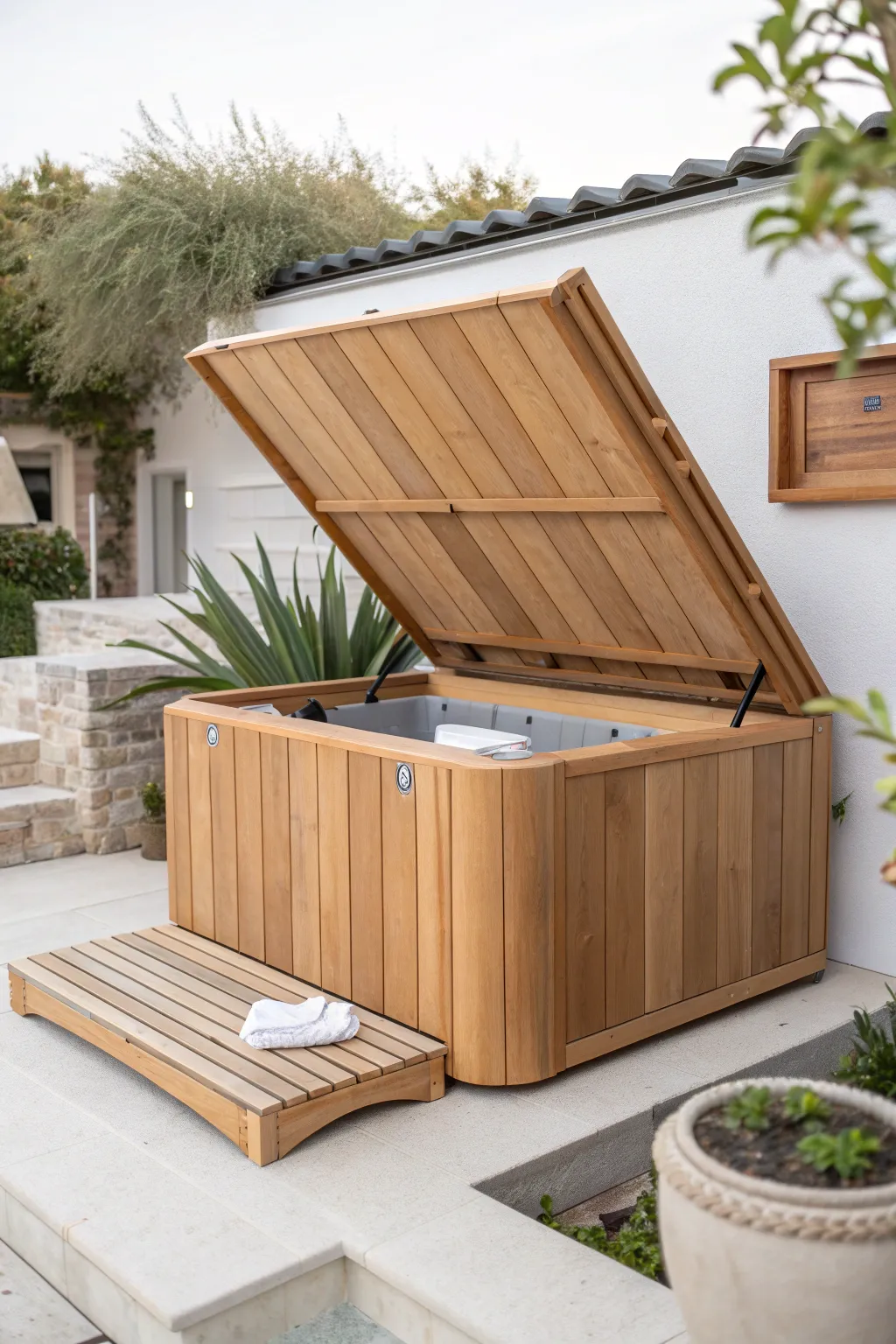 Effortless elegance: A minimalist bi-fold hot tub cover stand that blends beauty and functionality.