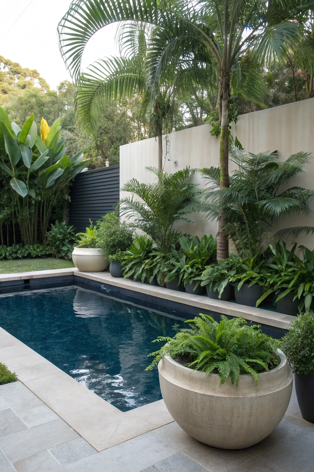 Surround your pool with lush greenery for a natural oasis feel. I often use large pots and planters to create a vibrant, living border around the water.