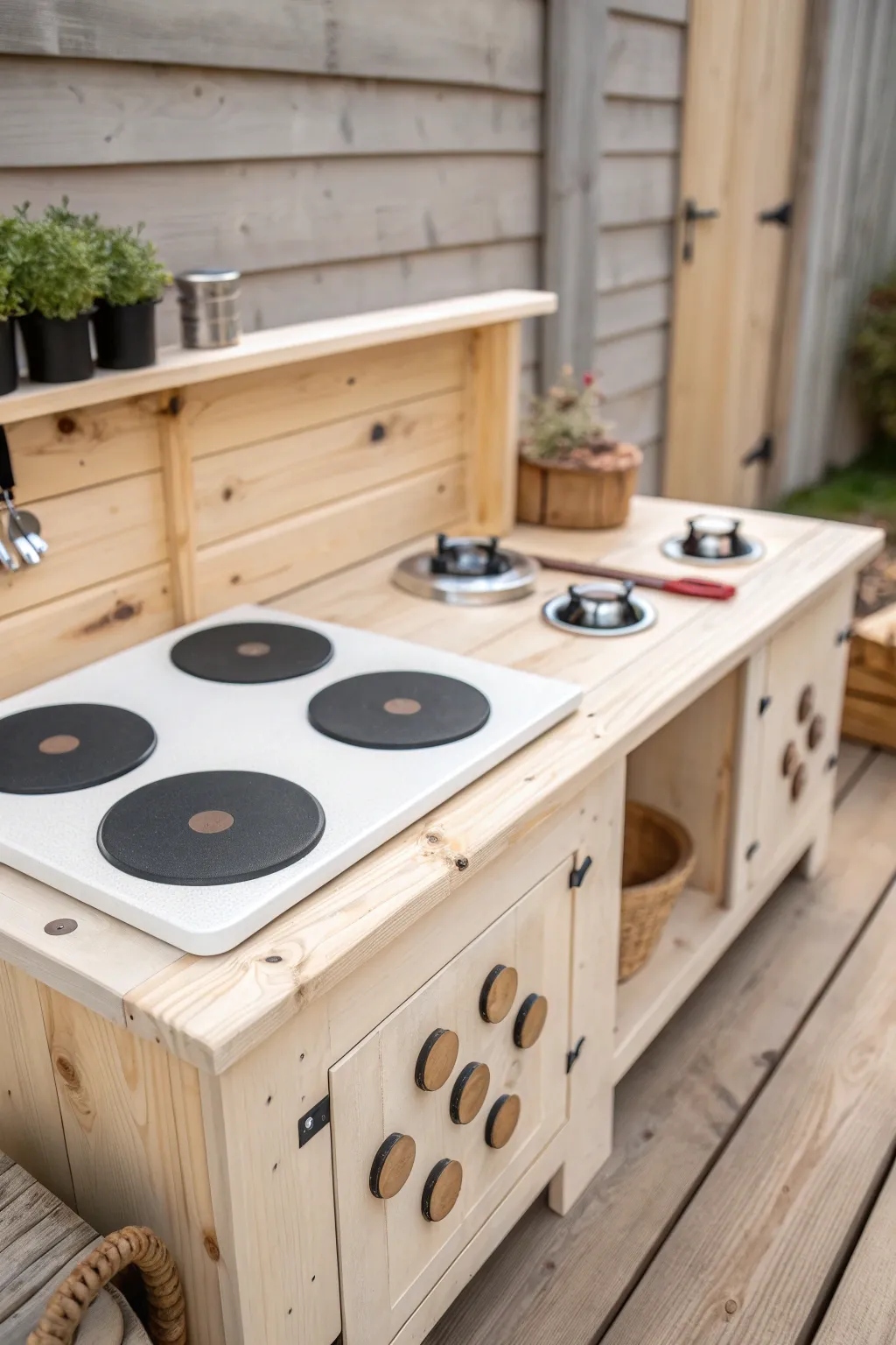 - Child-Sized Wooden Bench: Enhance your mud kitchen with a child-sized bench, offering a cozy spot for creative breaks.