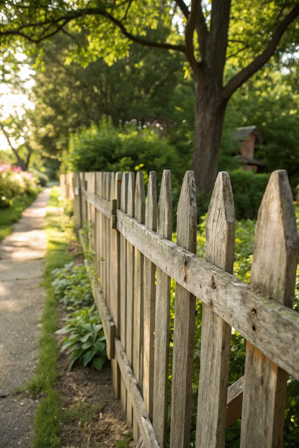 Embrace the beauty of natural aging with a rustic picket fence that harmonizes with your garden.