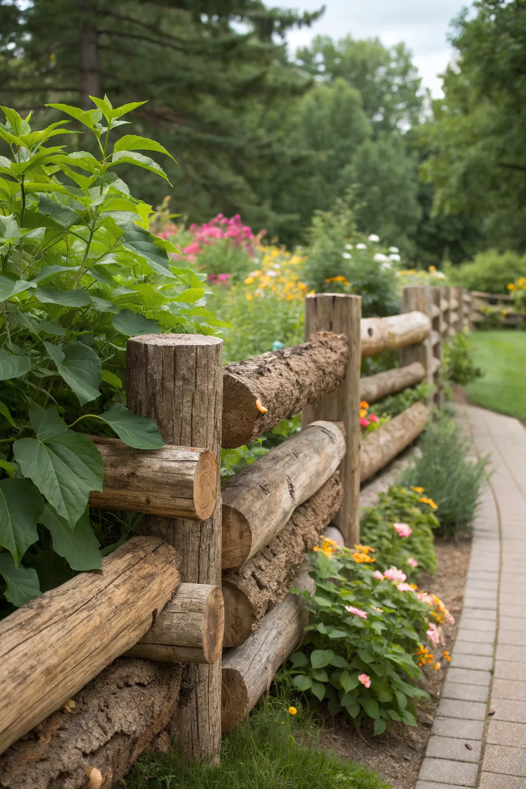 Build a fence from stacked logs to define your garden’s perimeter while maintaining a natural look. This solution adds both privacy and rustic charm.