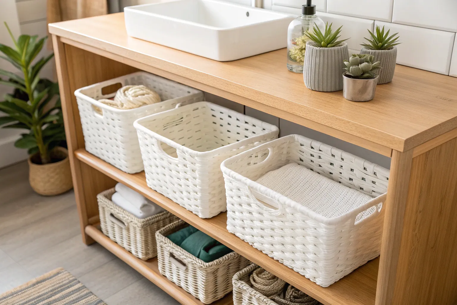 - Small Plastic Storage Baskets: Perfectly fit toiletries in compact baskets, making them easy to find and keep neat.