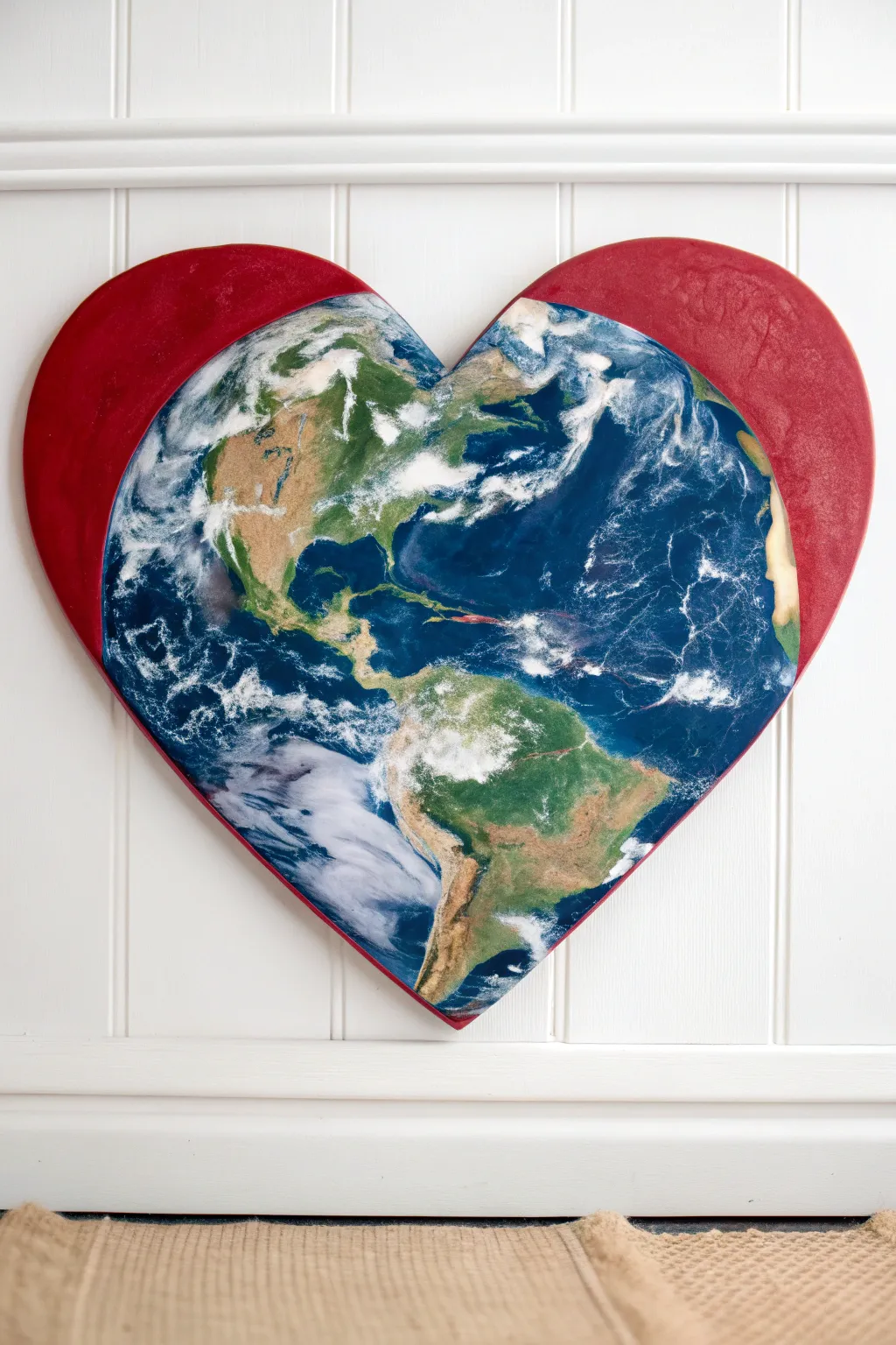 Paint the Earth inside a large heart to signify love for our planet. This piece is close to my heart, as it symbolizes the care and affection we should all have for our home.