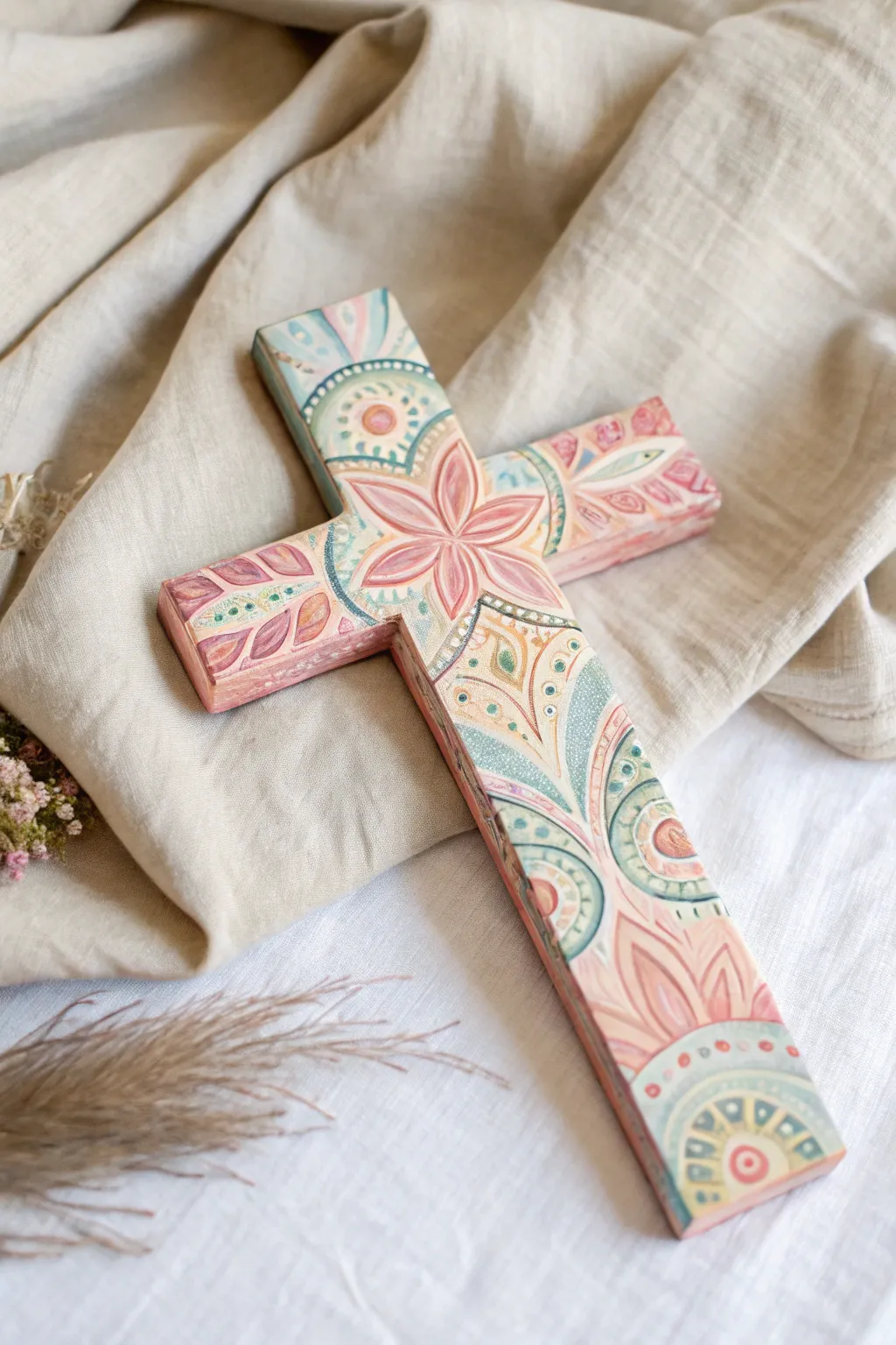 Paint wooden crosses with vibrant colors and patterns, a craft that’s become a staple in my workshop. Each cross tells its own unique story.
