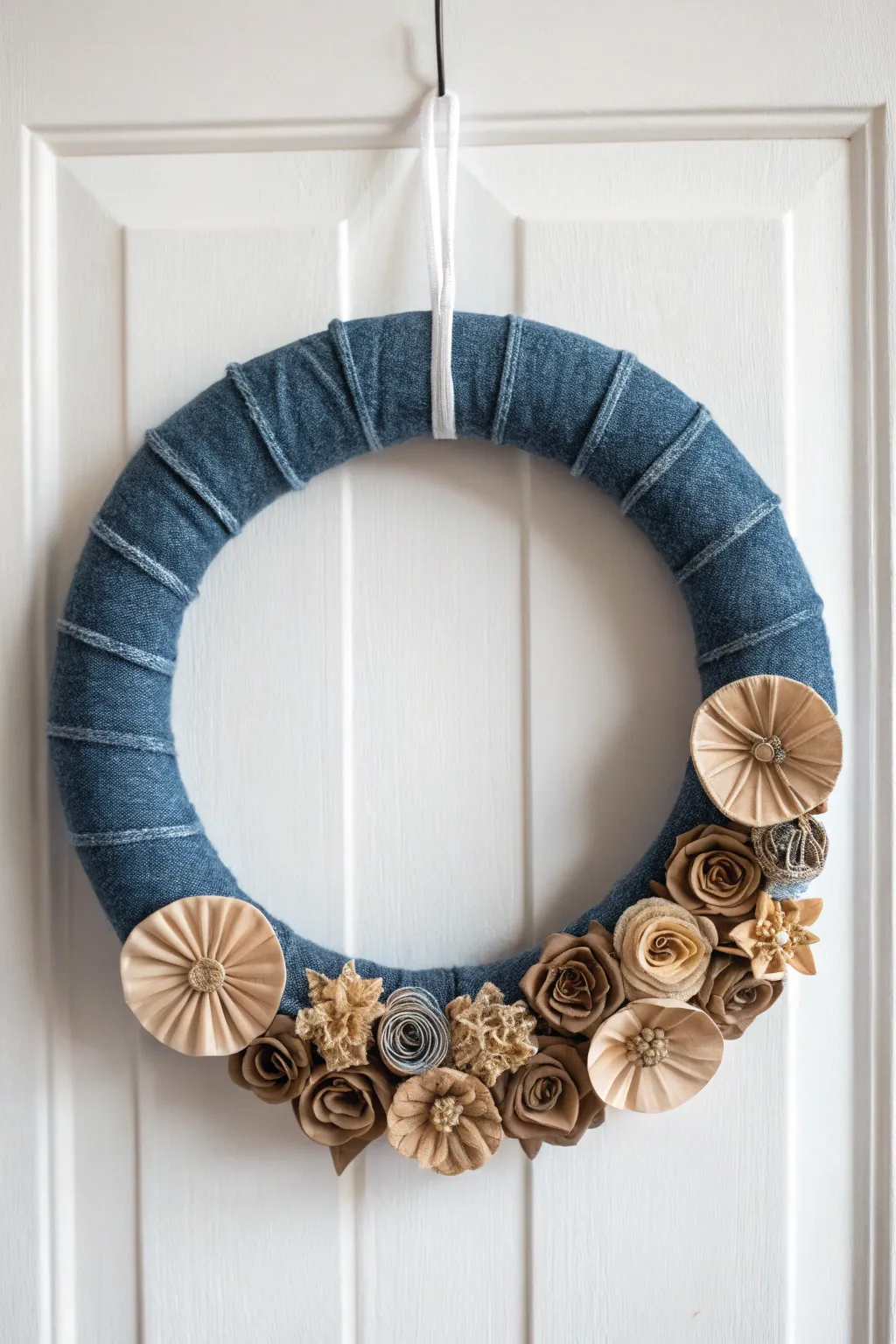 Transform your front door with a touch of minimalist boho charm — a handcrafted denim wreath that welcomes with style.