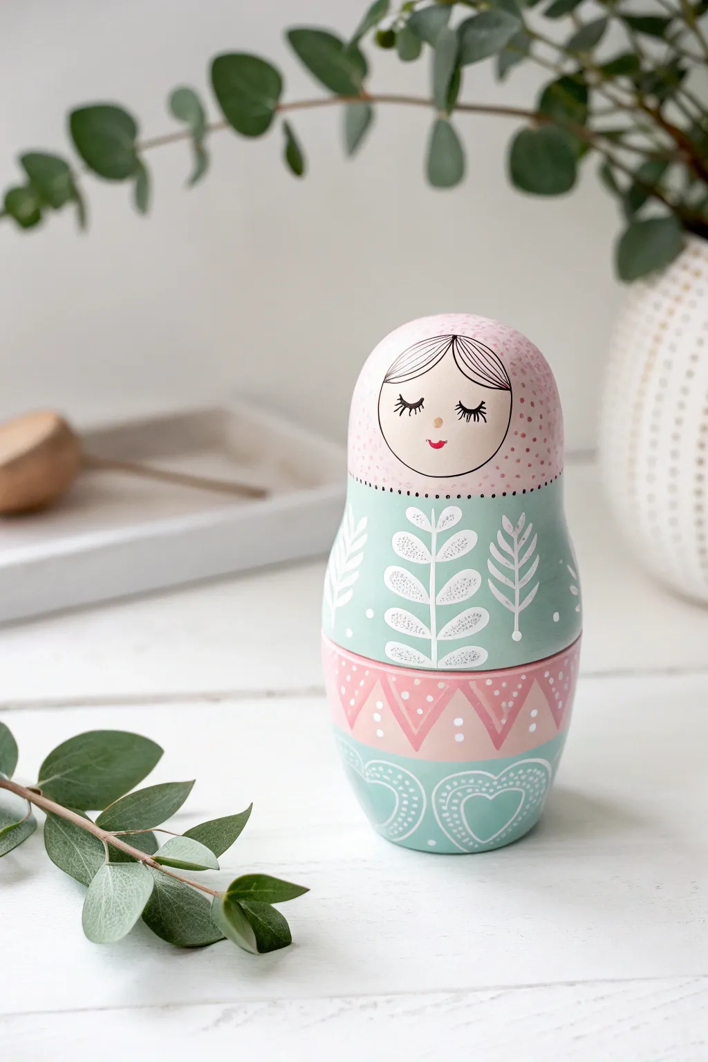 Use earthy tones and leaf motifs to craft nature-inspired nesting dolls. One spring, I painted a set with florals and vines, bringing a piece of the outdoors inside.