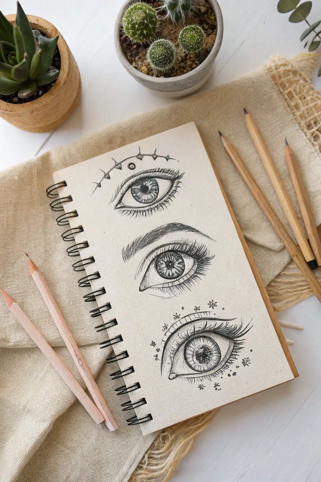 Create a page of multiple eye styles for a fun comparison. It’s like having a mini gallery right in your sketchbook!