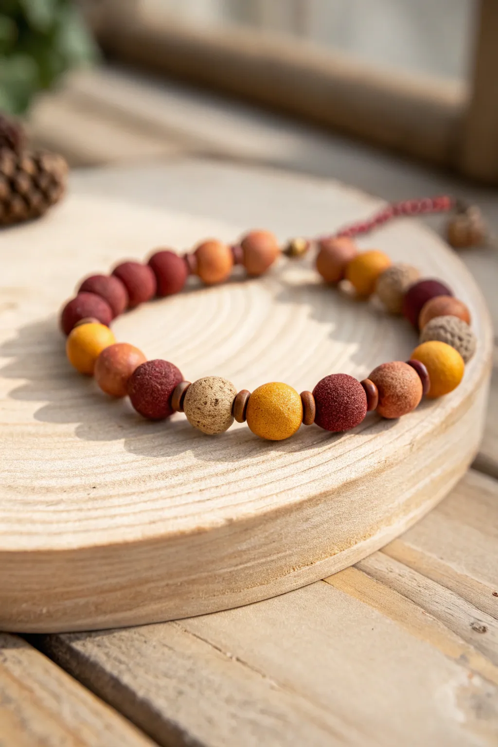 Craft a bracelet using clay beads in shades of orange, yellow, and brown, interspersed with tiny leaf charms. I made one last week, and it feels like wearing a piece of the forest on my wrist!