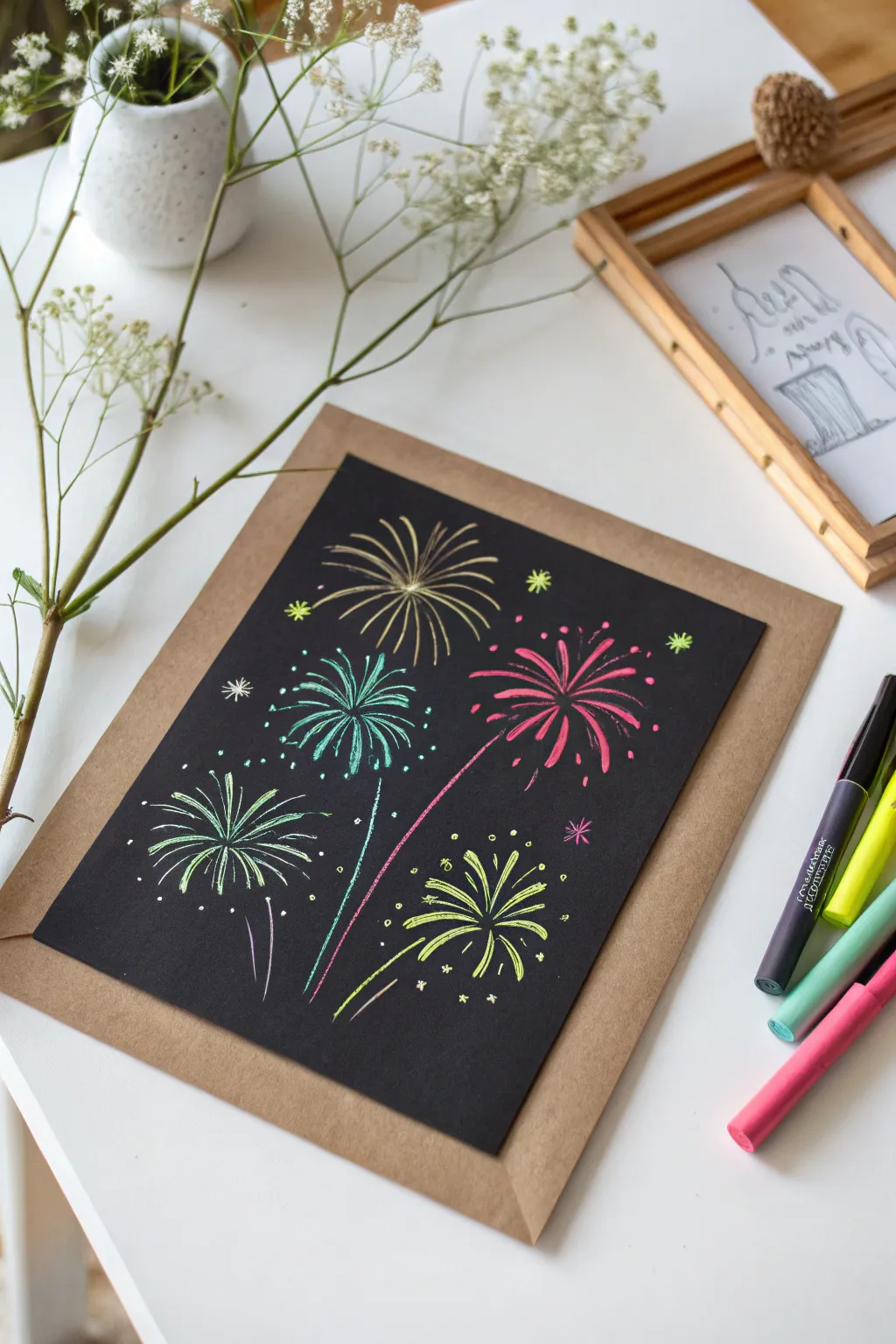 Create a colorful base with crayons, then cover it with black paint mixed with dish soap. Scratch away the black to reveal vibrant fireworks below—a favorite from my childhood.