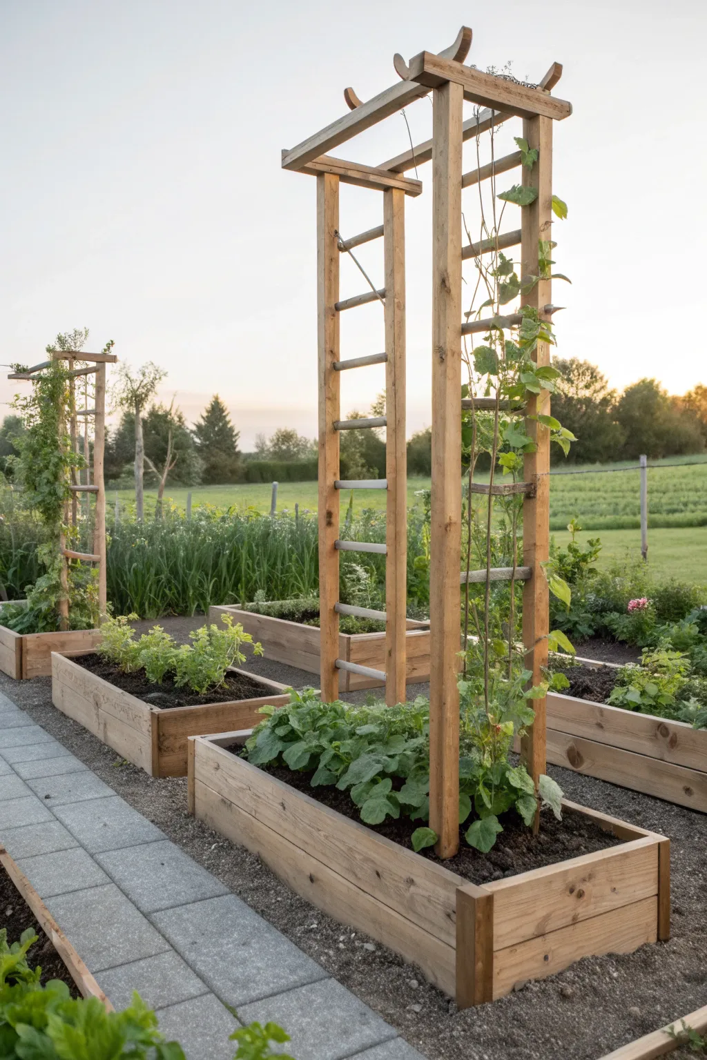 Utilize vertical space with trellises for climbing plants like peas and cucumbers. It’s a great way to save space and add a unique visual element.