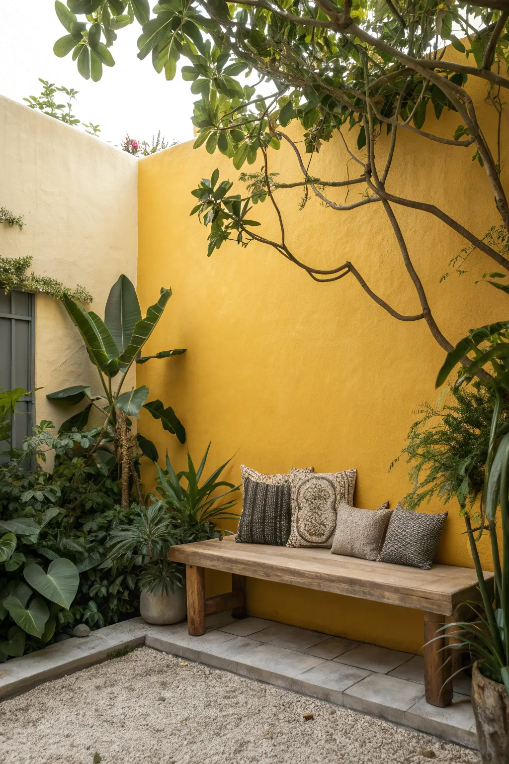 Create a focal point by painting an outdoor wall with a bold hue. My patio wall in a sunny yellow never fails to brighten even the cloudiest days.