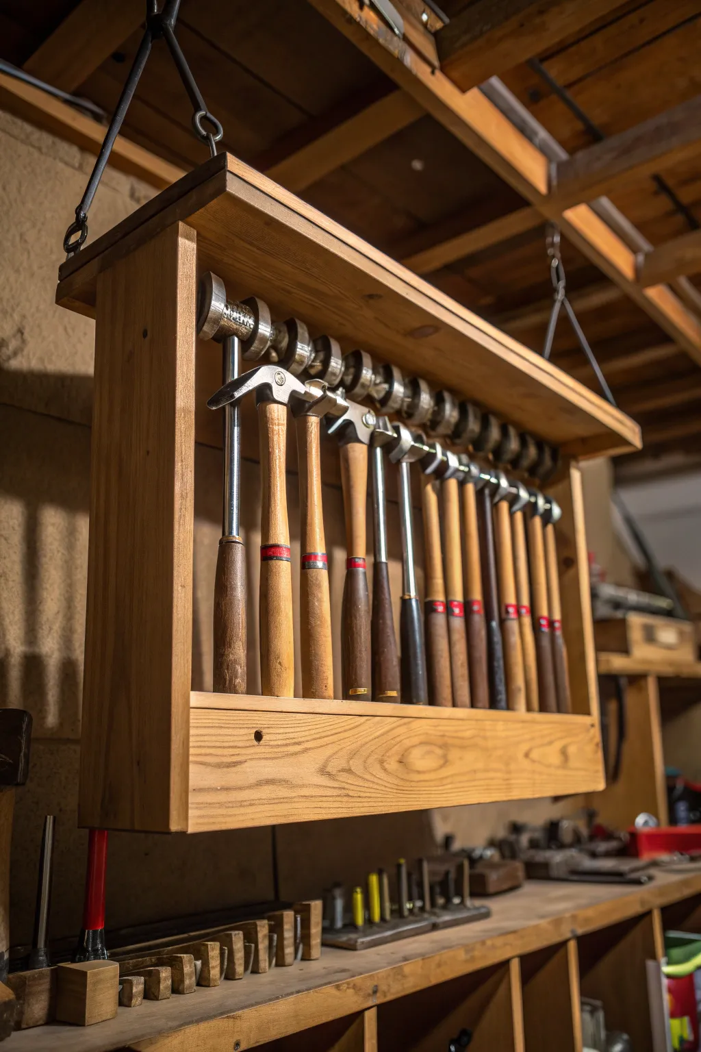 Elevate your workshop with a flexible rail system for hammer storage, combining functionality with style.