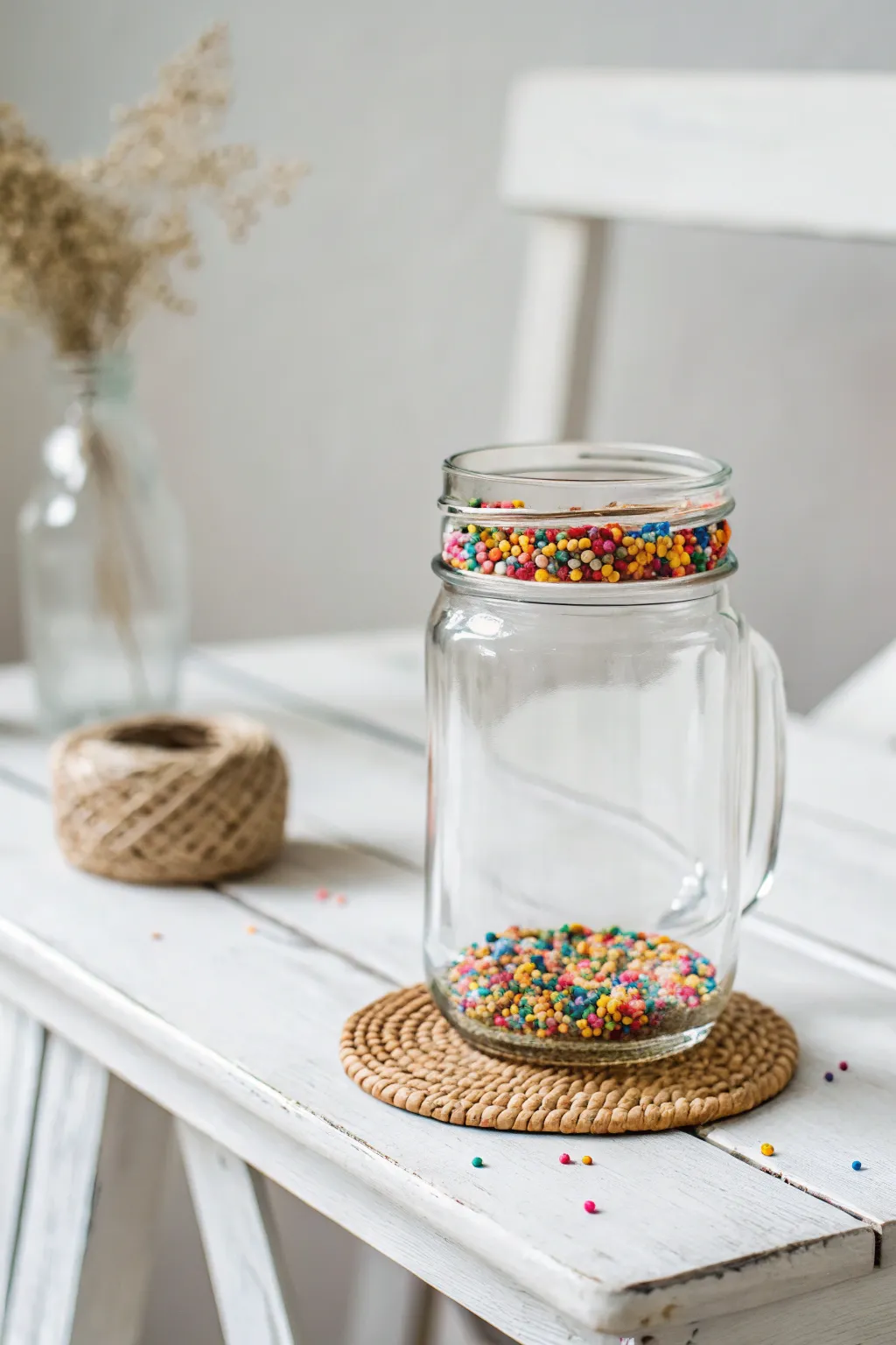 Dip the rims of mason jars in glue and then in colorful sprinkles. These are perfect for holding sweets or as a fun party favor.
