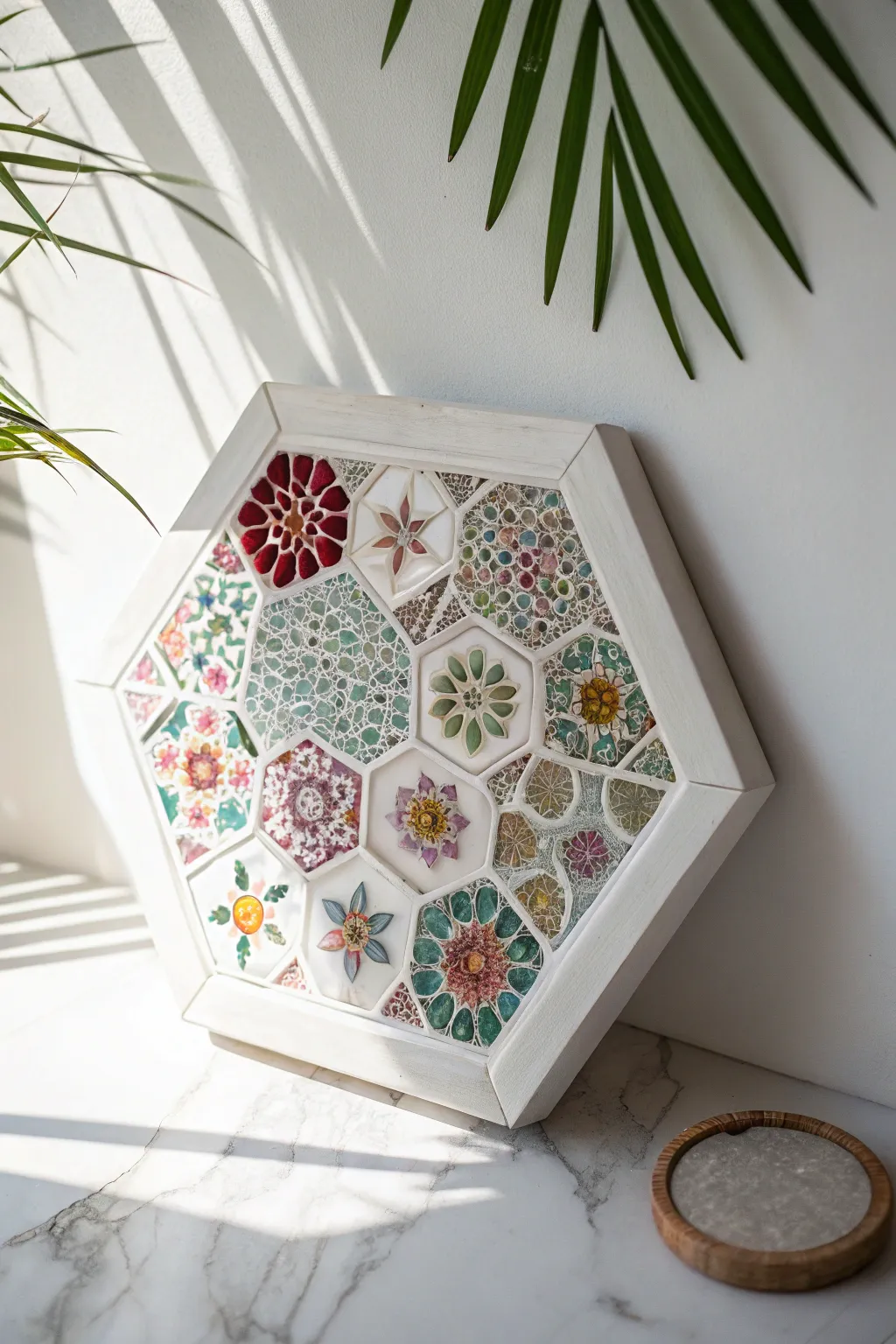 Craft a mosaic effect using small, colorful pieces. I created a mosaic hexagon with tiny glass tiles, and the light dances beautifully across it.