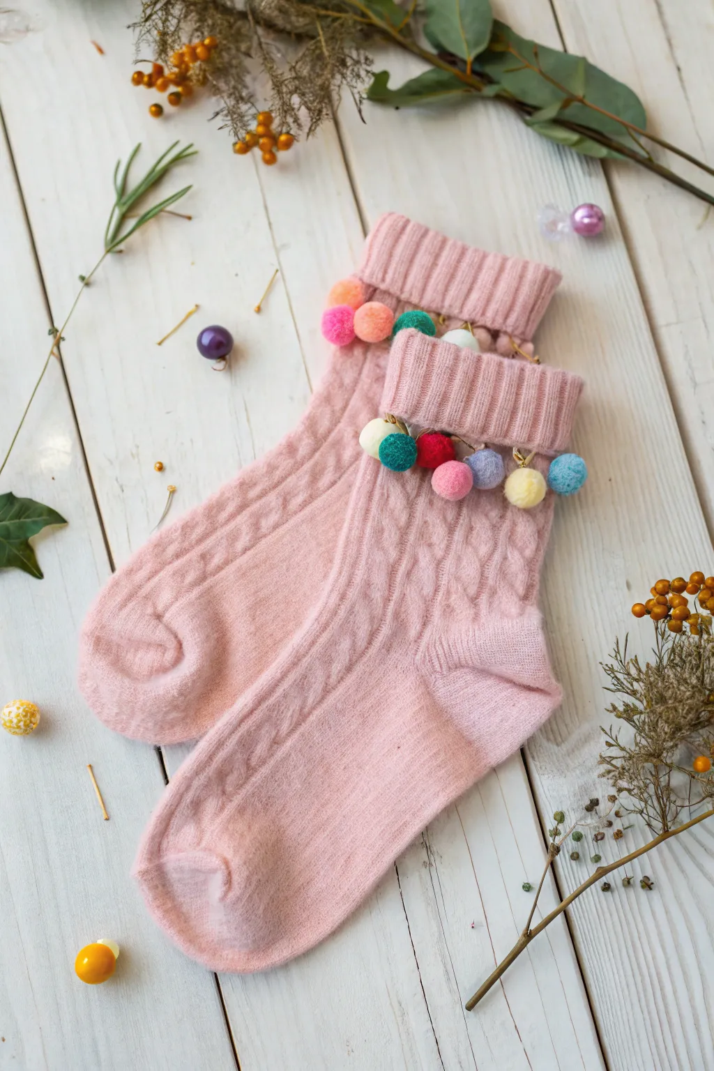 Spruce up your socks with colorful pom-poms for a playful and vibrant look. I remember adding these to my socks for a party, and they were a total hit!