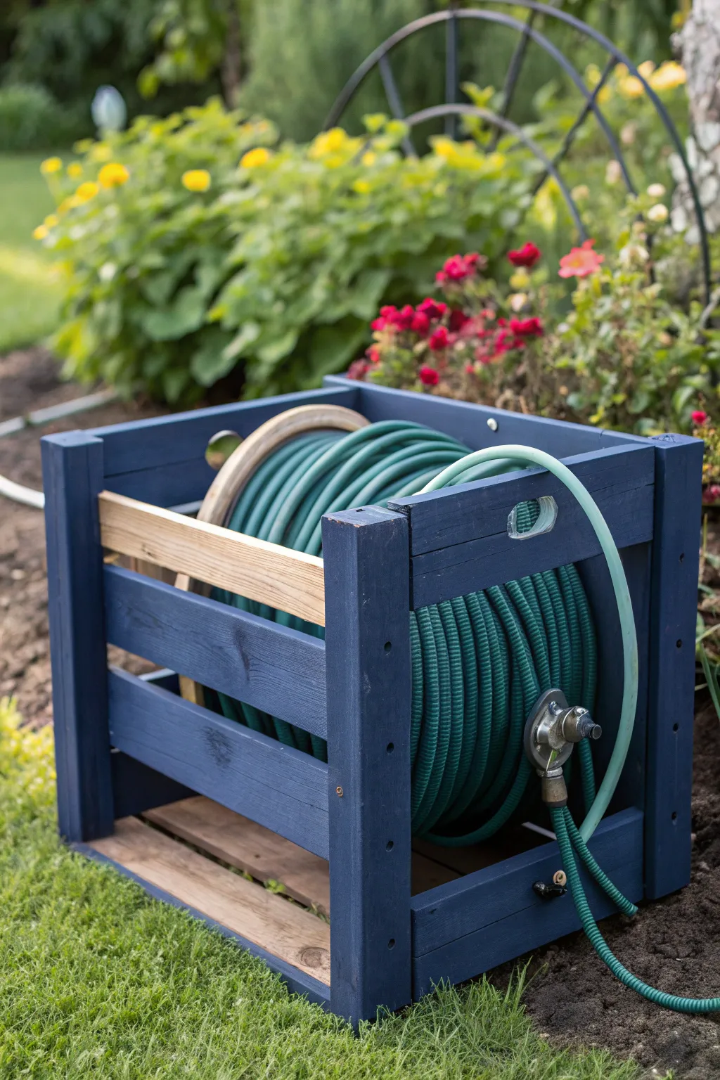 Elevate your garden style with this handcrafted wooden crate hose reel—where practicality meets artistry.