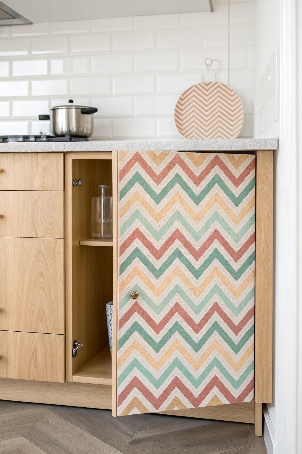 • Multicolor Chevron Peel and Stick Wallpaper: Add cheer with multicolor chevron wallpaper, perfect for an eye-catching cabinet transformation.