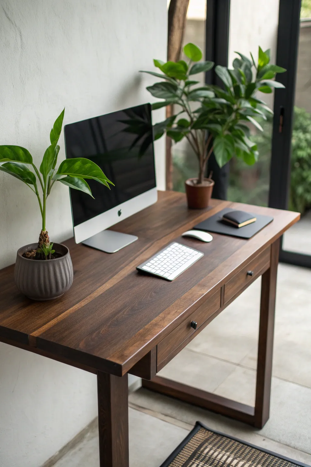 Incorporate natural elements like wood or plants to add warmth. My wooden desk top and leafy friends create a calming environment.