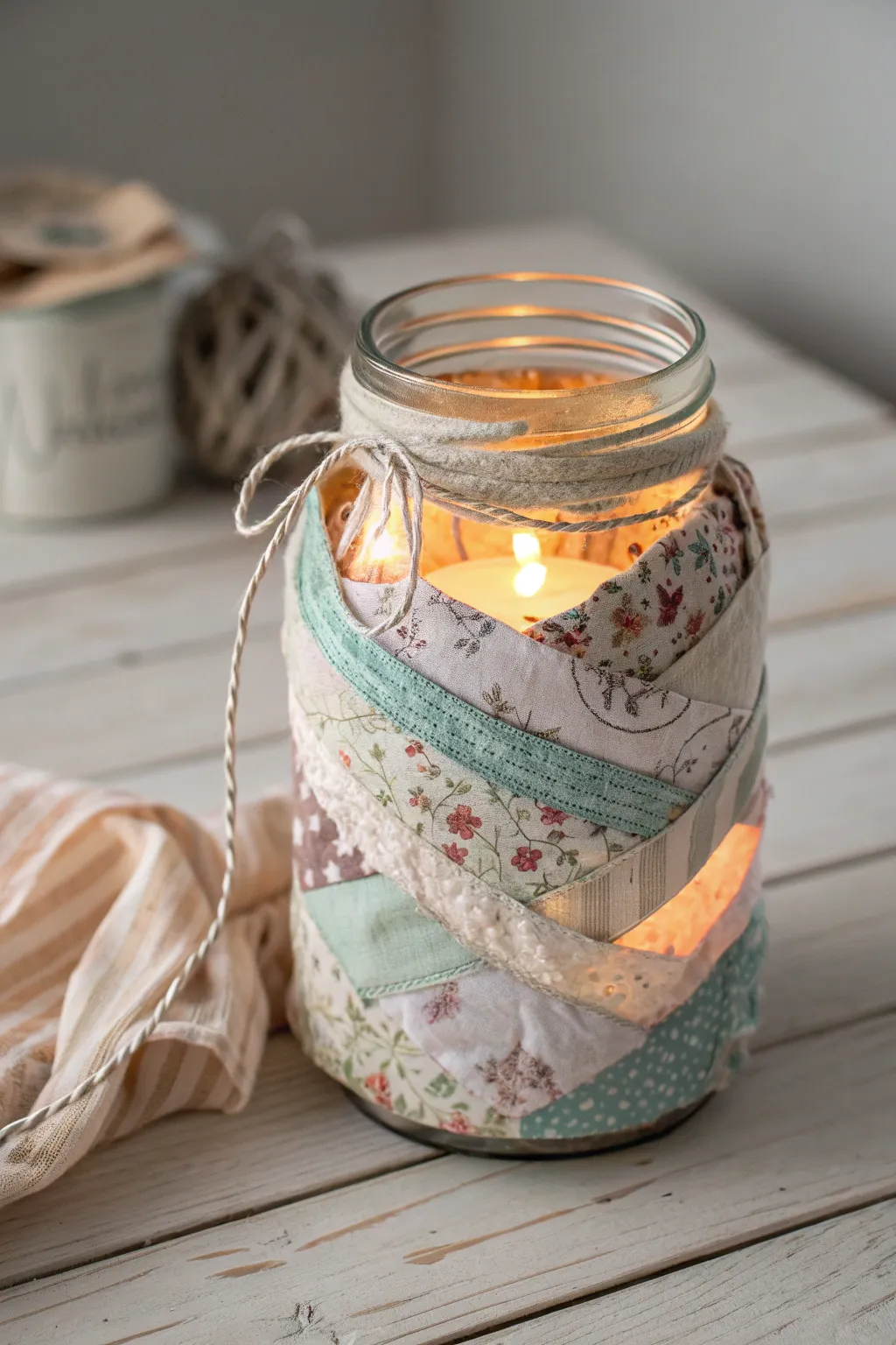 Use leftover fabric scraps to wrap around a jar, creating a cozy textile glow. These are a great way to use up scrap fabric from other projects.
