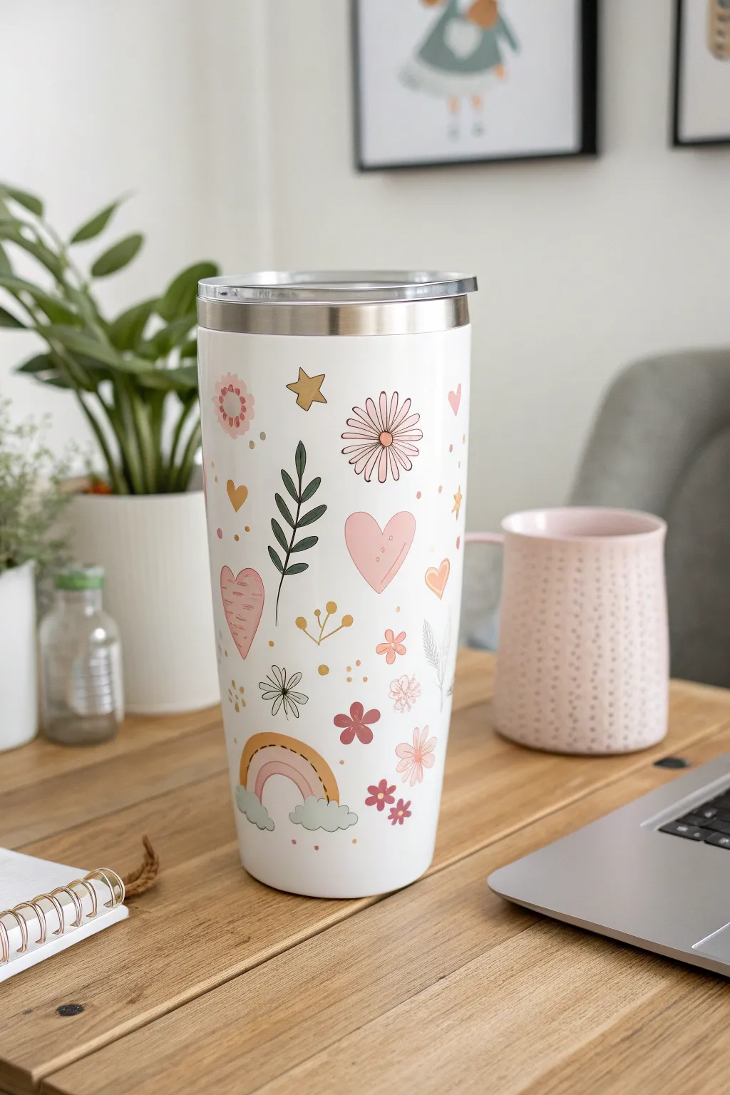 Let her create her own tumbler with custom stickers. This DIY approach is a favorite in my workshops, allowing creativity to flow freely.