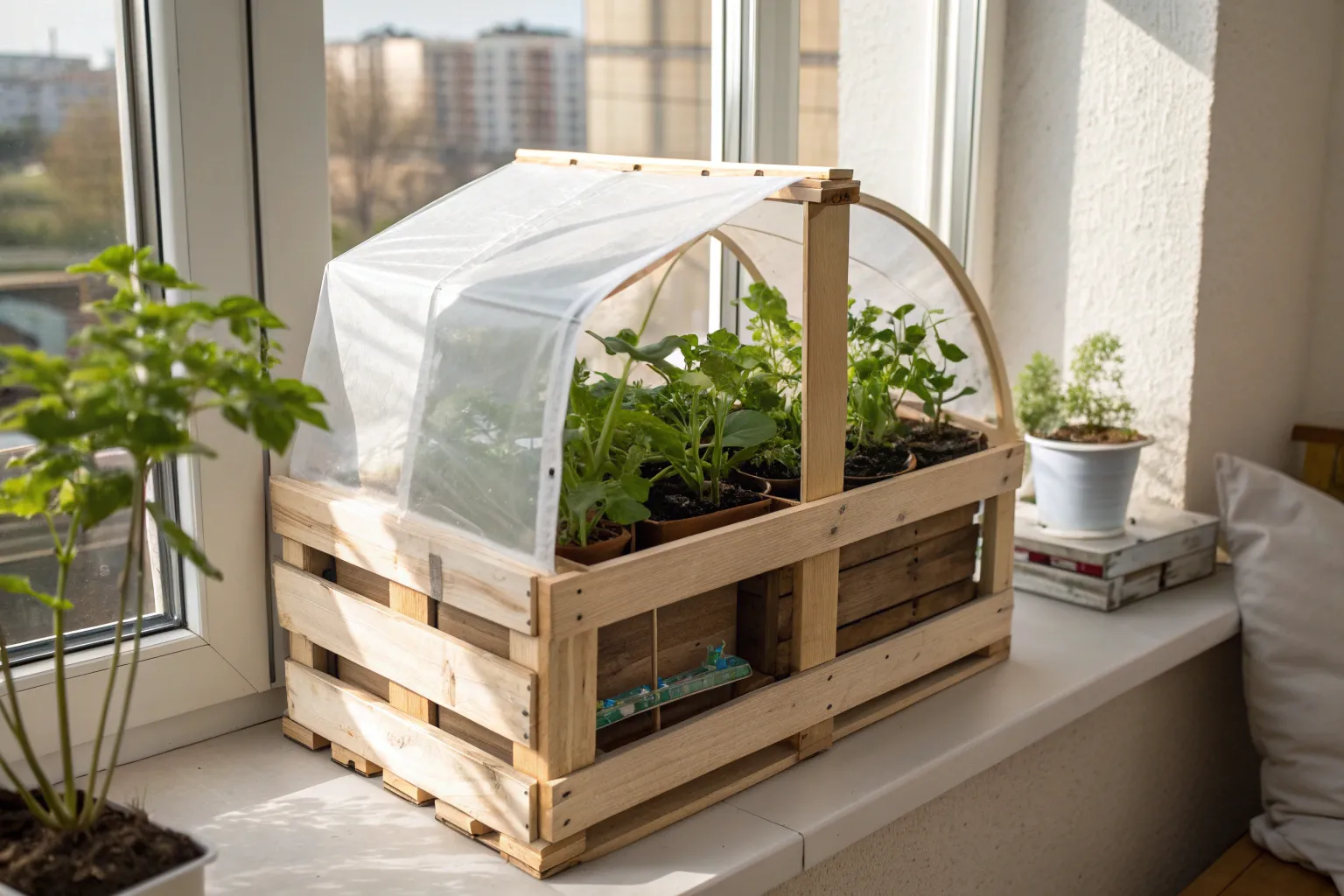 Transform old wooden crates by adding a clear plastic cover. It’s a fantastic way to reuse materials and keep your plants cozy.