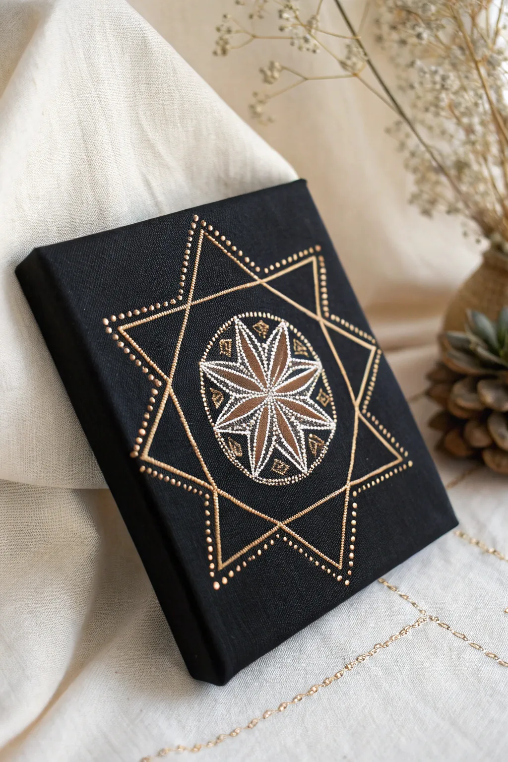 Create mesmerizing geometric patterns that dance across the canvas. I love using metallic paints for a bit of shine that stands out beautifully on black.