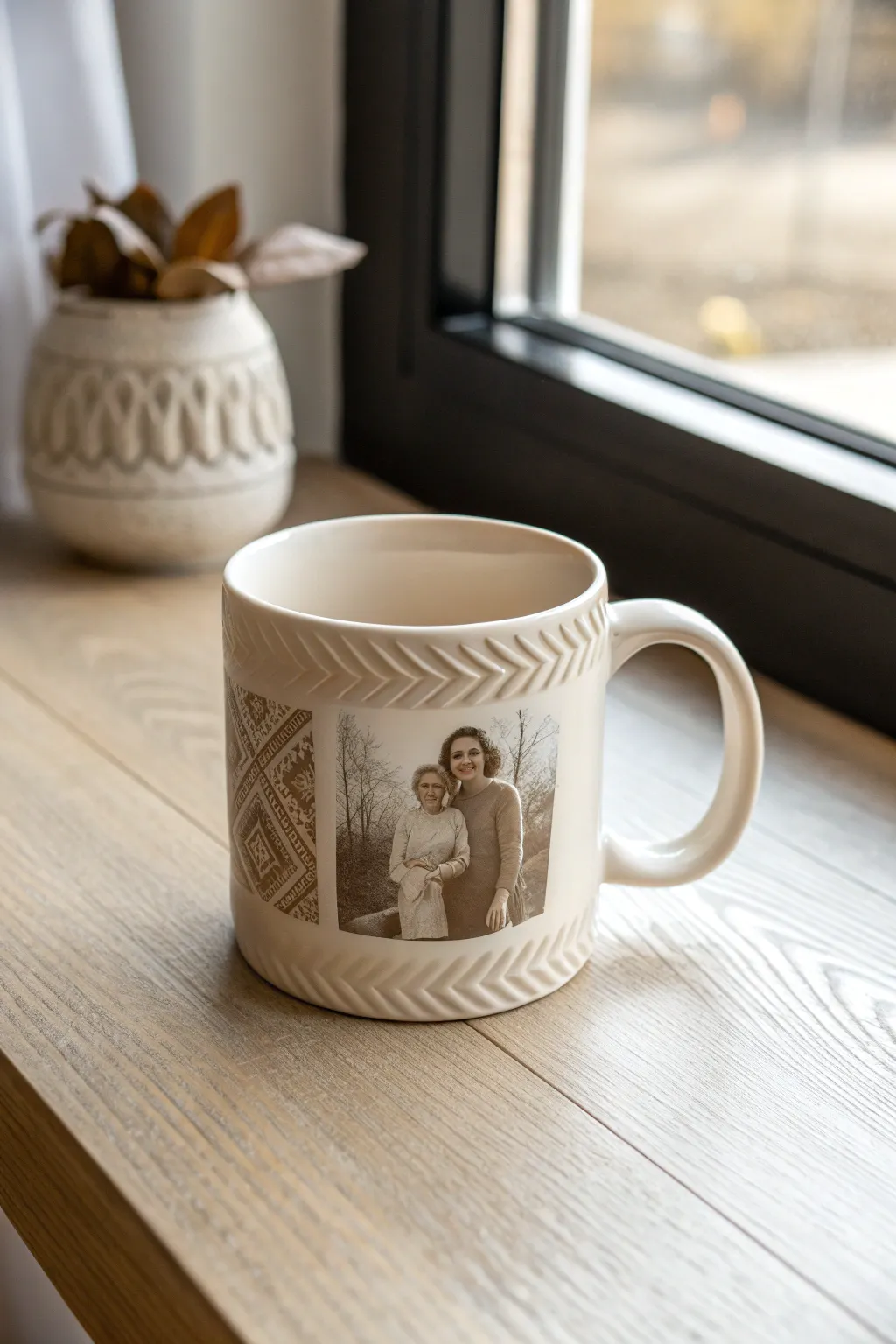 Go retro with a vintage photo and design elements. I enjoy sipping from a mug adorned with my grandparents’ wedding photo, adding a nostalgic charm.