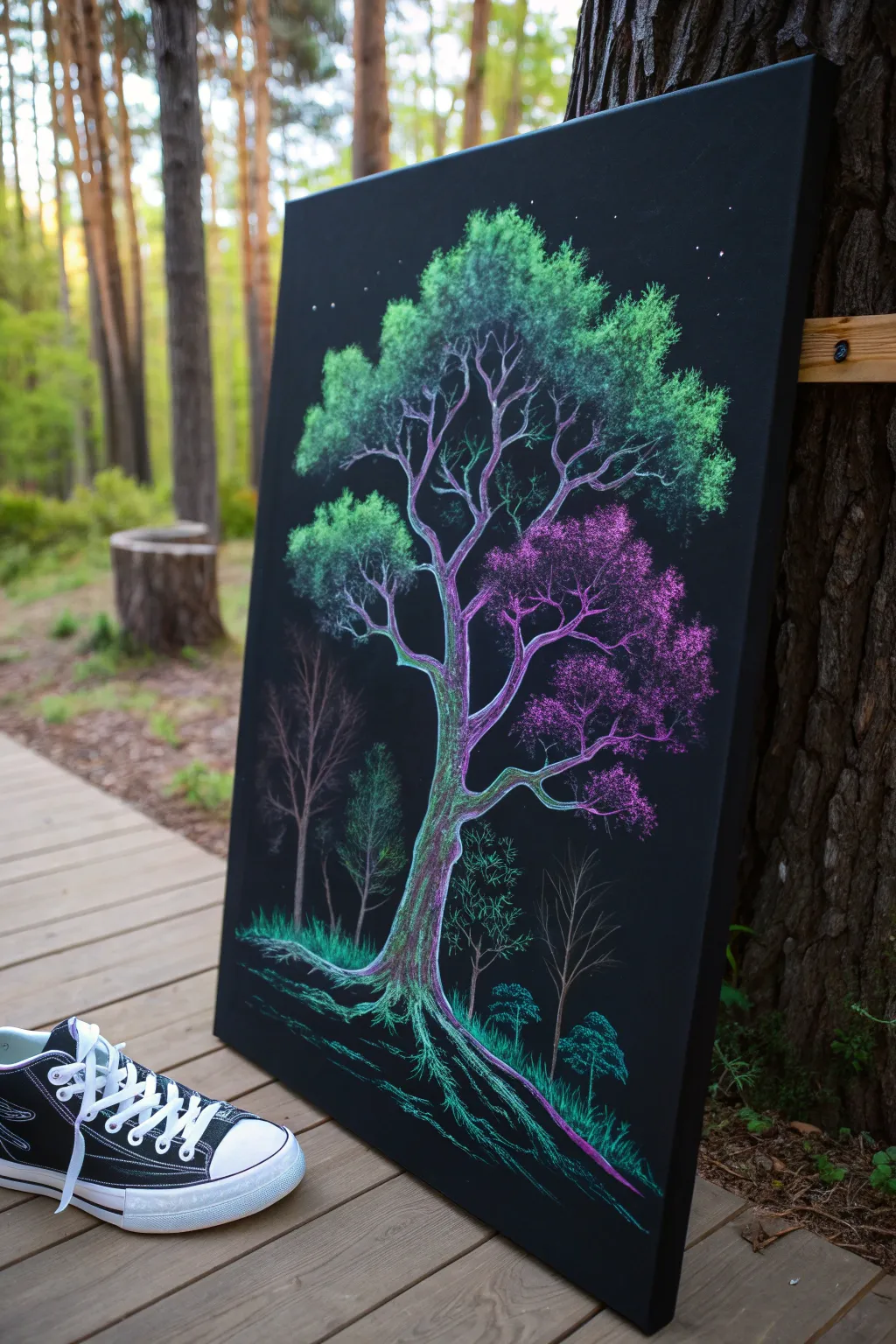 Bring an enchanted forest to life with neon accents. The glowing trees and foliage against the black canvas create a mystical and inviting scene.