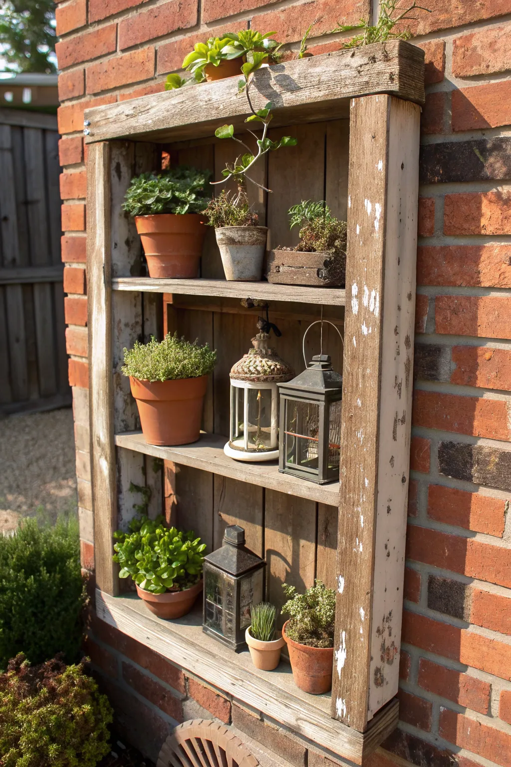 Add shelves to a sturdy window for a unique outdoor shelf unit. It’s a practical yet beautiful way to display plants and trinkets in my garden.