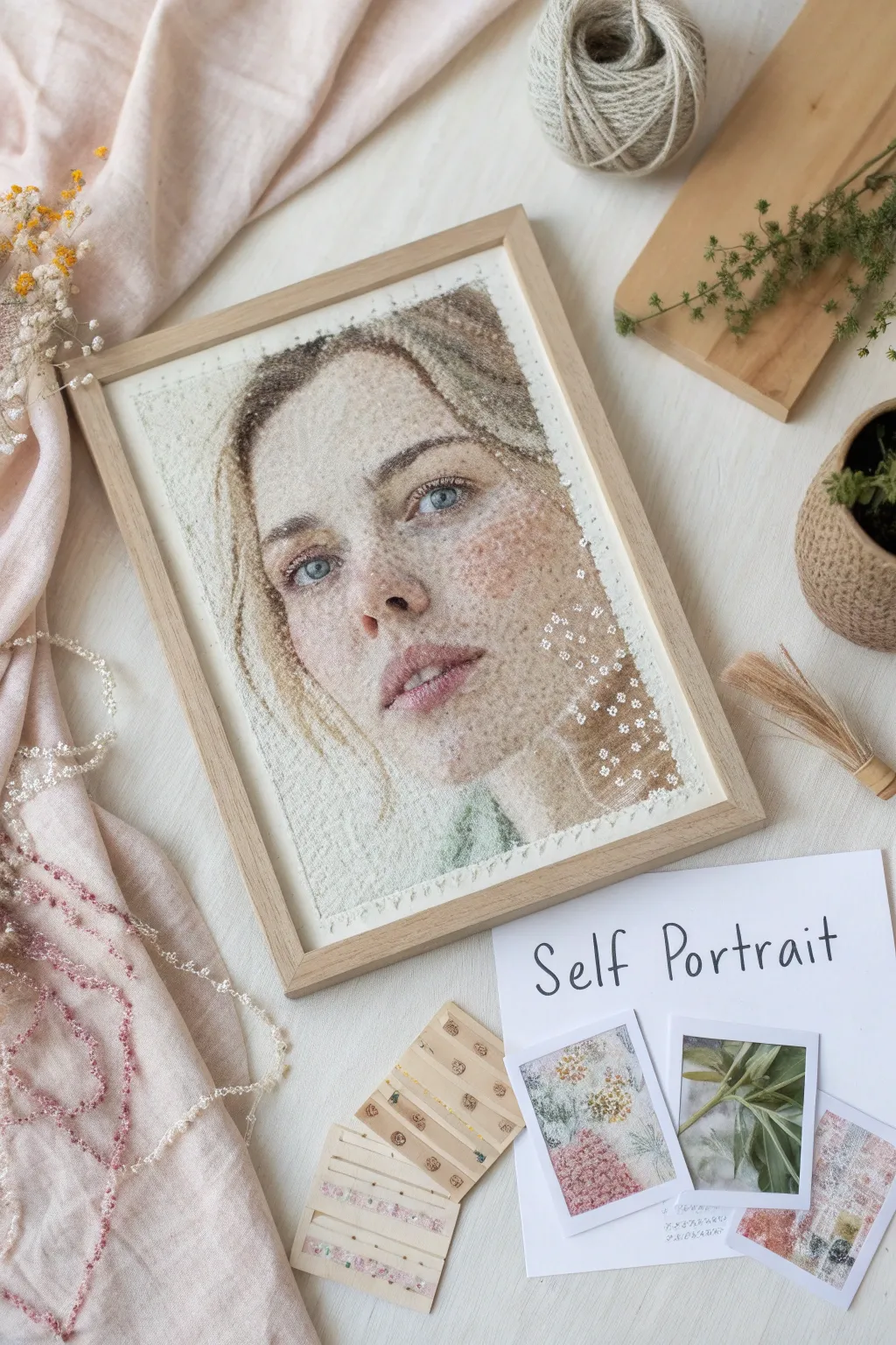 Create a self-portrait using a blend of different materials and images. This technique allows each feature to tell a different part of your story, making it a true mosaic of who you are.