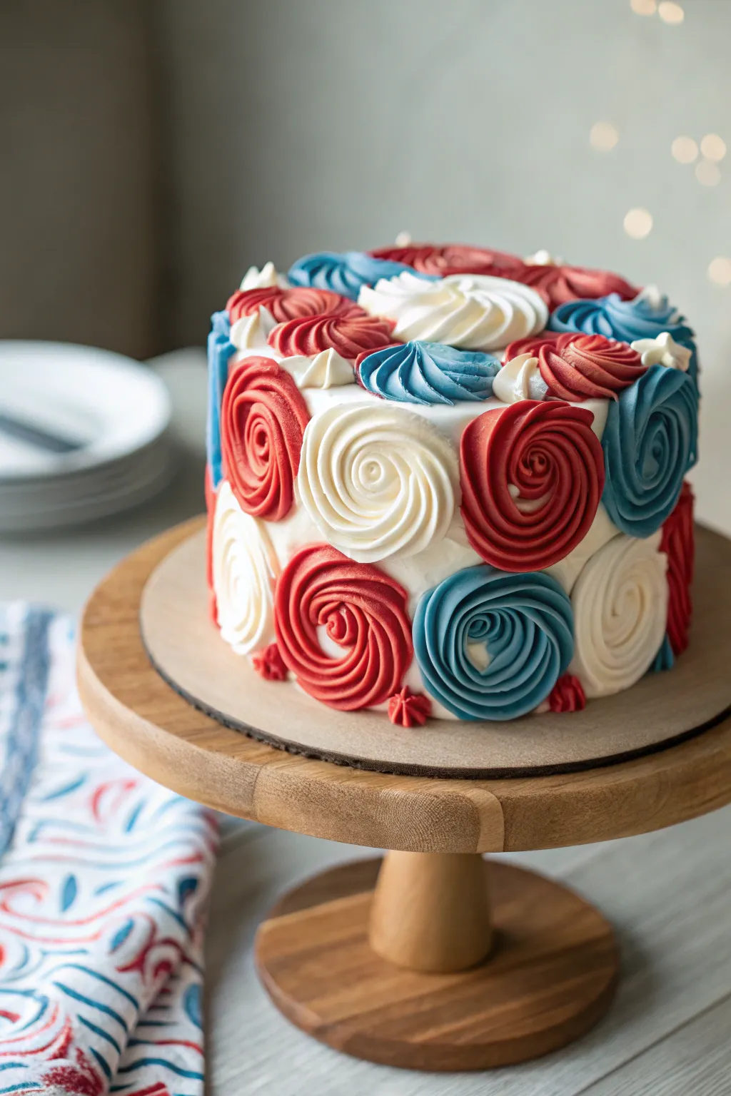 Create mesmerizing swirls on your cake using red, white, and blue icing. I love how easy it is to make a statement with just a piping bag and a little creativity!